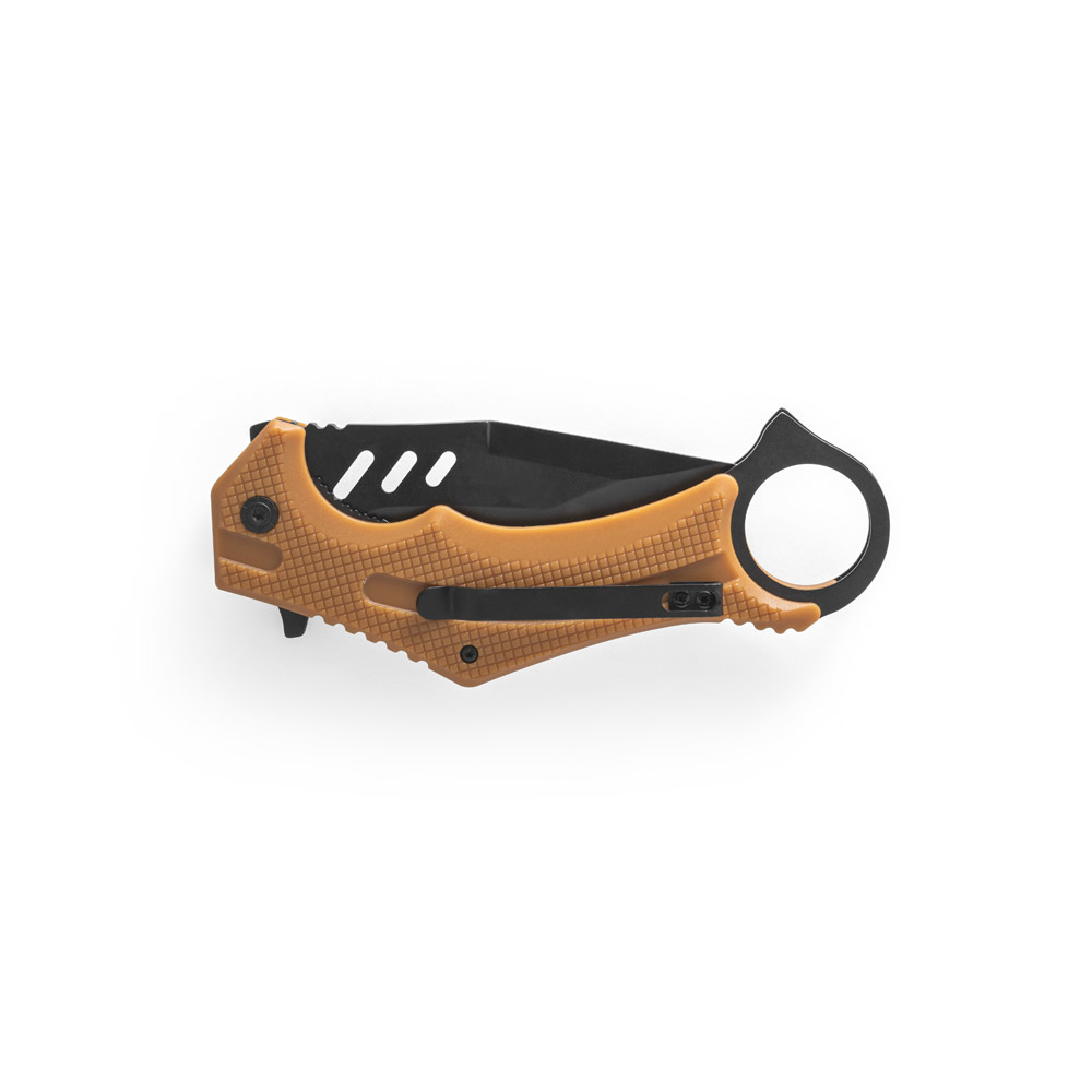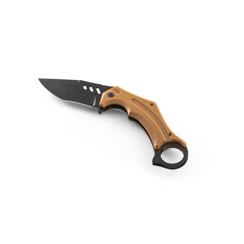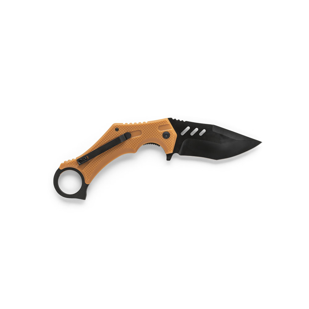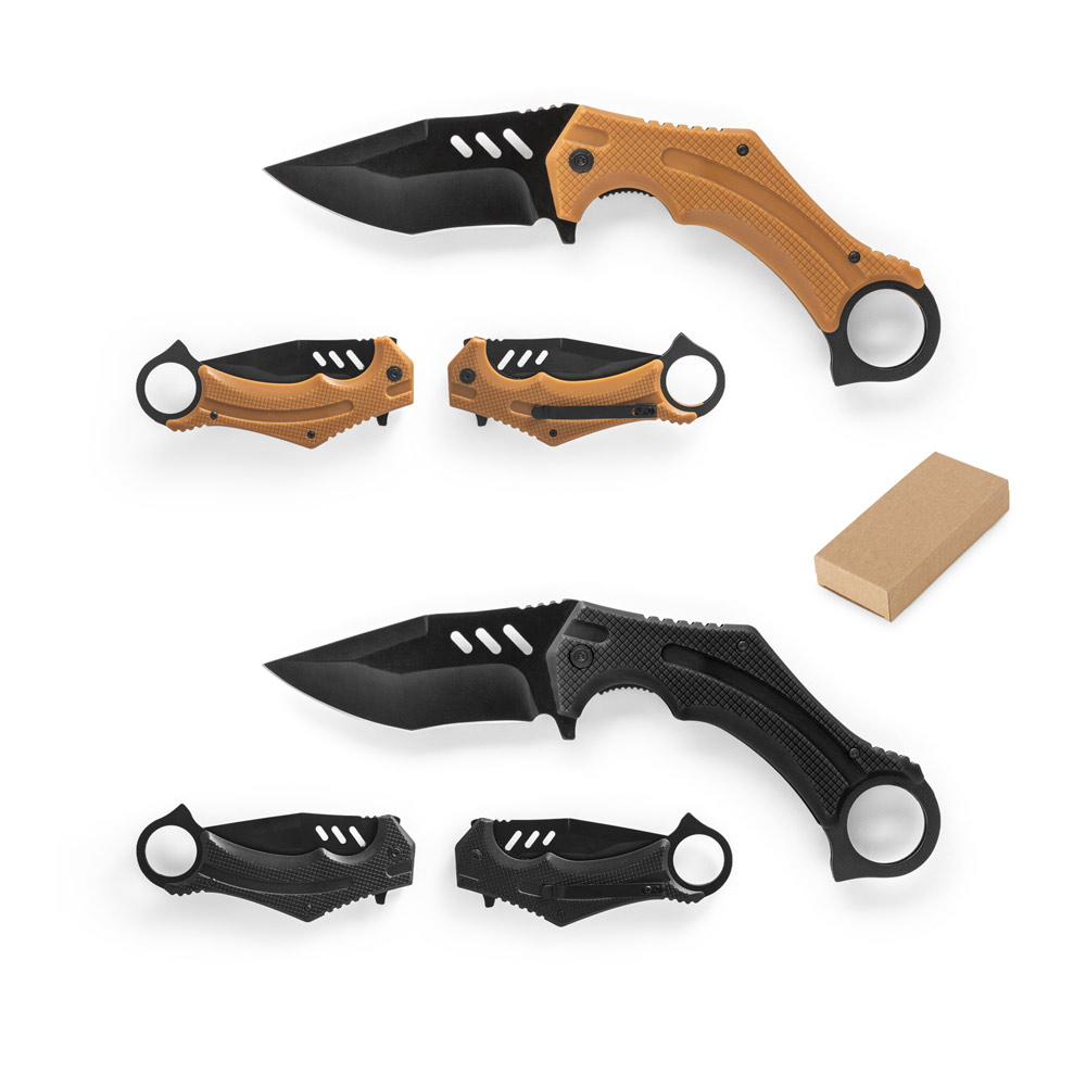 Canivete dobrável em aço inox e cabo em plástico. Fornecido em caixa presente de papel kraft reciclado. Aberta: 230 x 40 x 10 mm | Fechada: 140 mm
