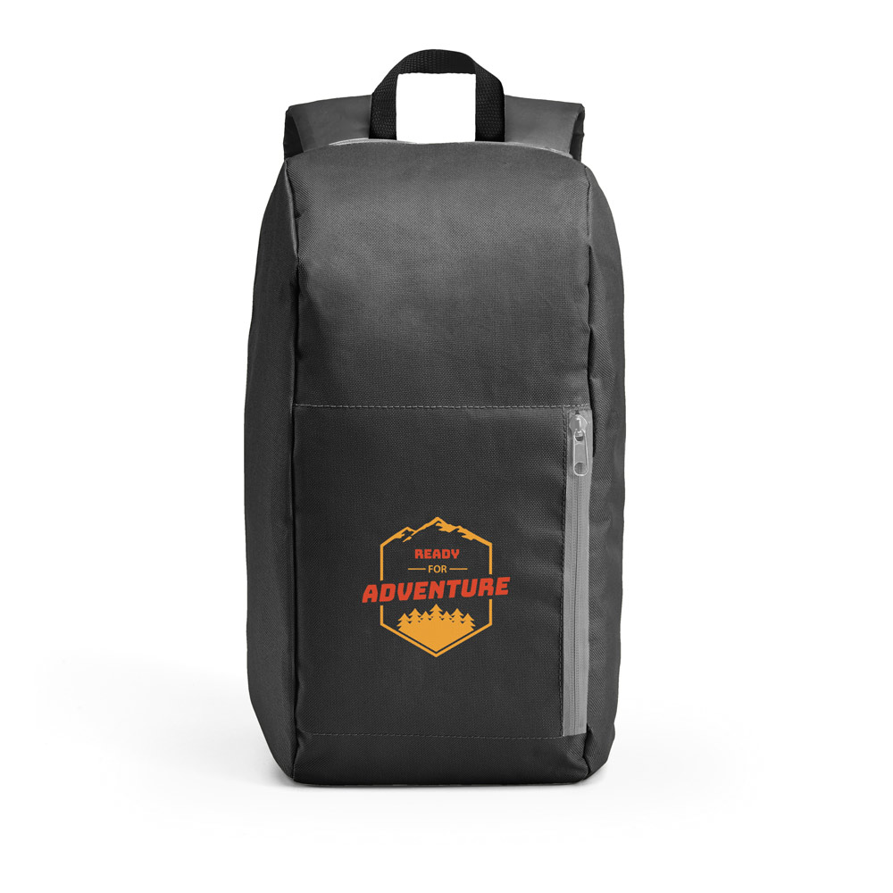Mochila em 600D com bolso exterior frontal com zíper. Parte posterior e alças almofadadas. Capacidade até 10 L. 245 x 400 x 115 mm