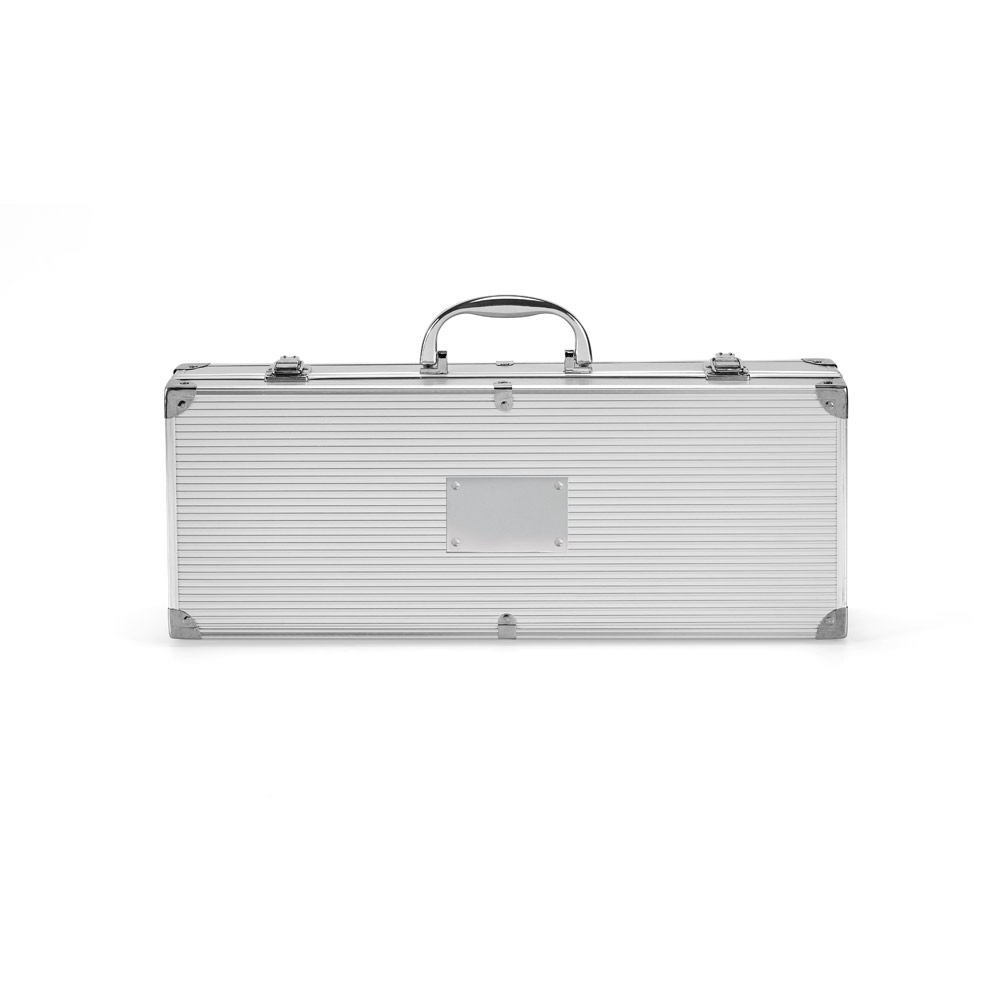 Kit churrasco em estojo de alumínio. Composto por luva de cozinha em poliéster e 6 utensílios em aço inox: faca chefe, 1 faca japonesa, 1 pinça, 1 garfo, 1 espátula e 1 afiador. Certificação EU Food Grade. Estojo: 450 x 170 x 80 mm | Placa: 80 x 50 mm