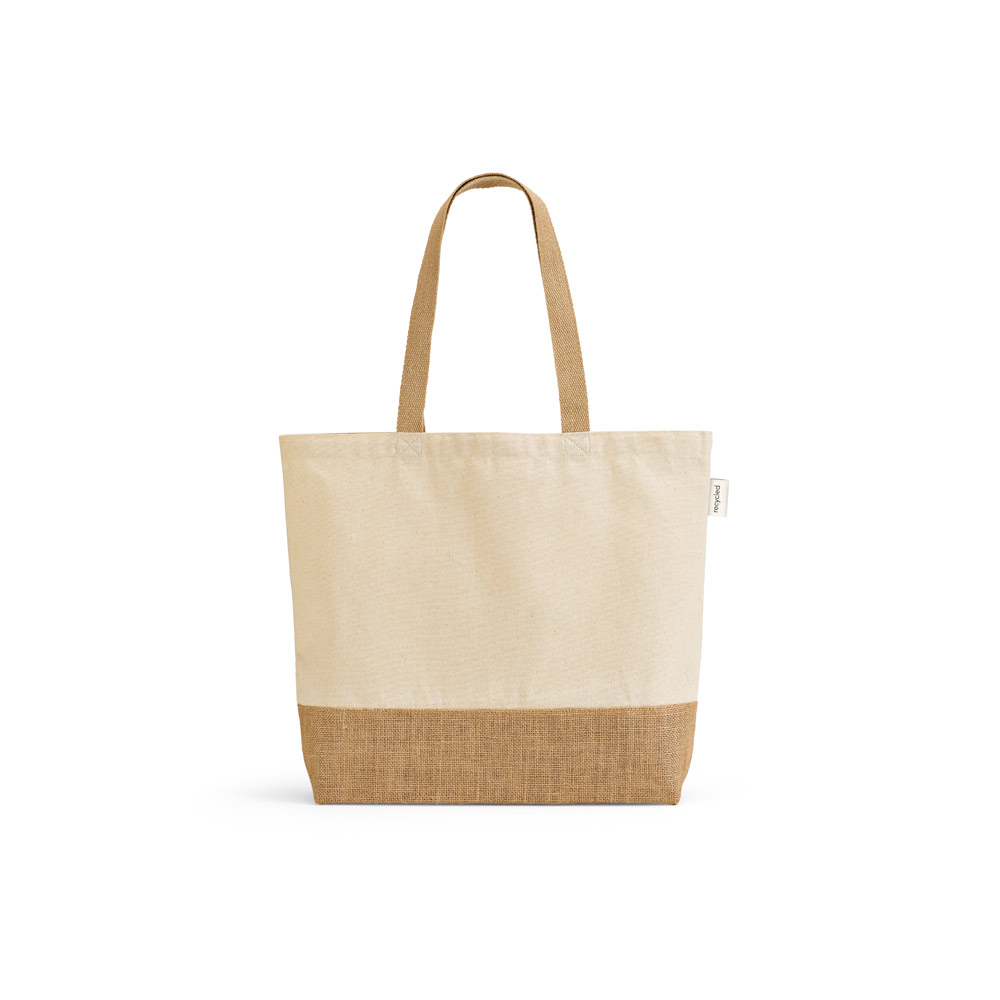 Sacola em 70% algodão reciclado e 30% poliéster reciclado (220 g/m²) com base em juta. Alças em webbing com 65 cm. 460 x 380 x 100 mm