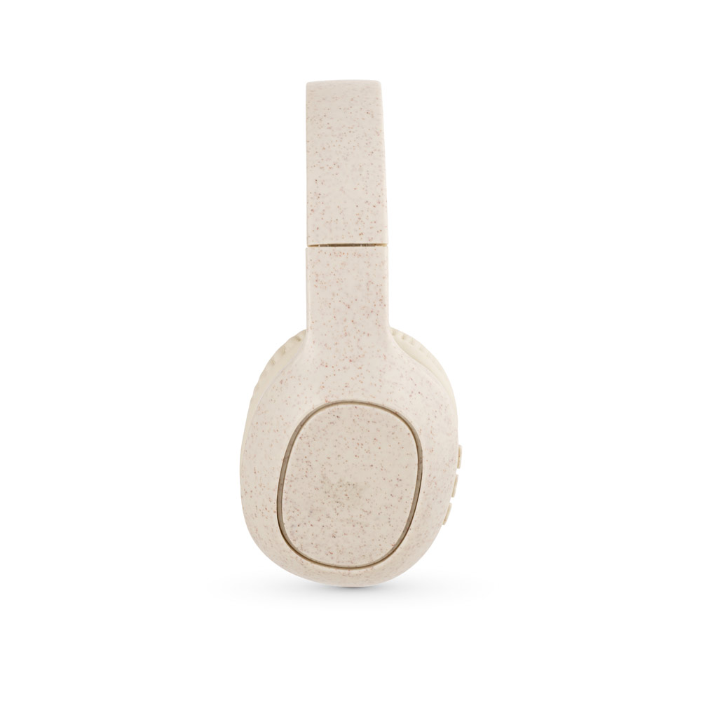 Fone de ouvido dobráveis wireless em fibra de palha de trigo e ABS. Potência de 32 mW e transmissão BT v5’0 com alcance até 10m. Bateria com capacidade de 400mAh e autonomia, aproximada, de 13 horas. Incluso porta AUX, slot para cartão microSD e cabo de carregamento USB-C. Botões de controle com +/- e ligar/desligar. Fornecido em caixa presente de papel kraft reciclado. A cor e o resultado da impressão nos materiais naturais pode variar entre produtos. Fones de ouvido (fechados): 185 x 185 x 74 mm | Caixa: 120 x 90 x 160 mm