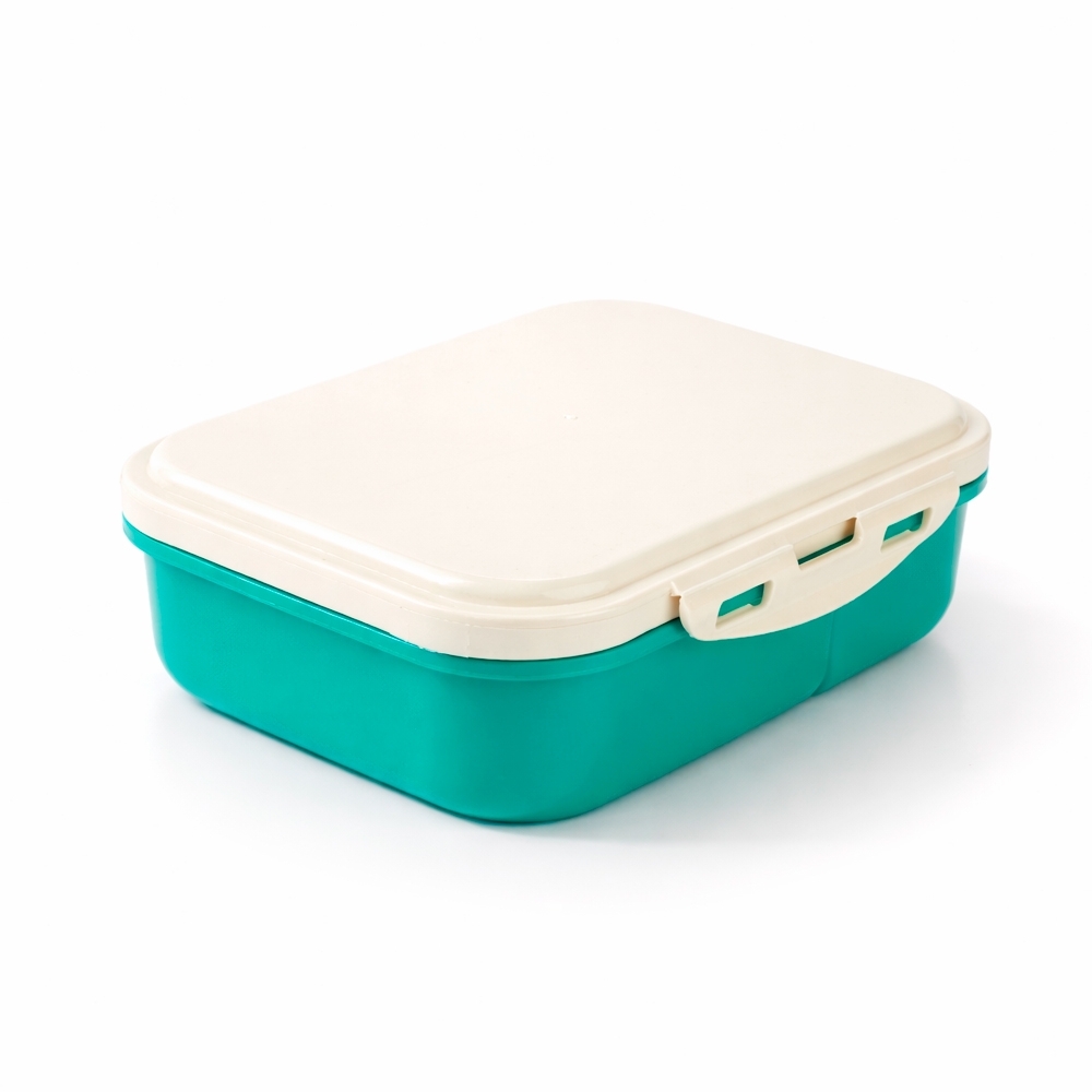Marmita em plástico polipropileno (PP) livre de BPA com capacidade máxima de 900ml. Possui tampa com duas travas laterais para fechamento e três divisórias fixas. Acompanha colher e garfo em PP. OBS: Capacidade de 775ml quando enchida até o limite das divisórias