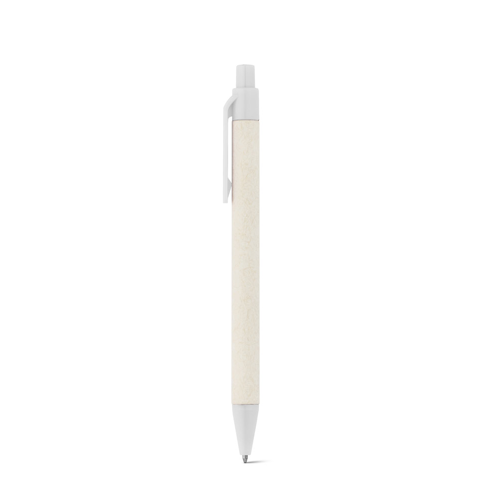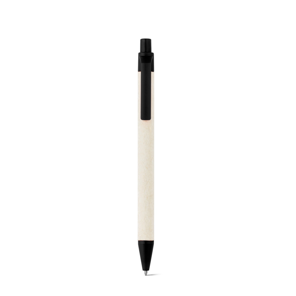 Esferográfica produzida através de pacotes de leite reciclados, contribuindo para o reaproveitamento do cartão e alumínio. Corpo em cartão e componentes coloridos em ABS 100% reciclado. Escrita em azul até 1.5 km. ø10 x 139 mm