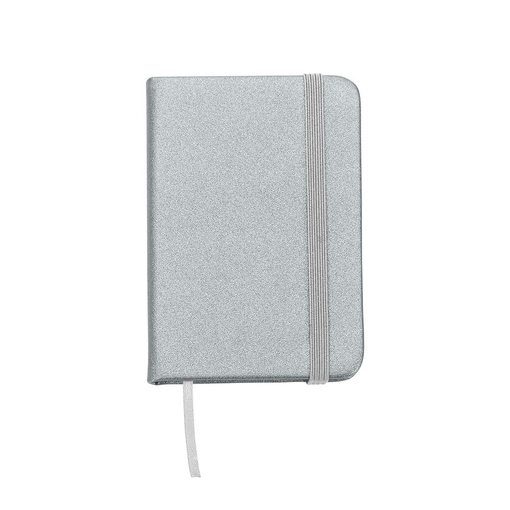 Mini Caderneta em material sintético brilhante com marcador de página em cetim e fita elástica para fechar. Contém aproximadamente 80 folhas amareladas sem pauta.