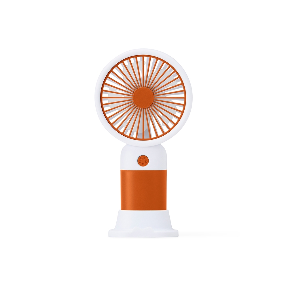 Mini ventilador plástico recarregável com base removível e botão de acionamento. Acompanha cabo usb.