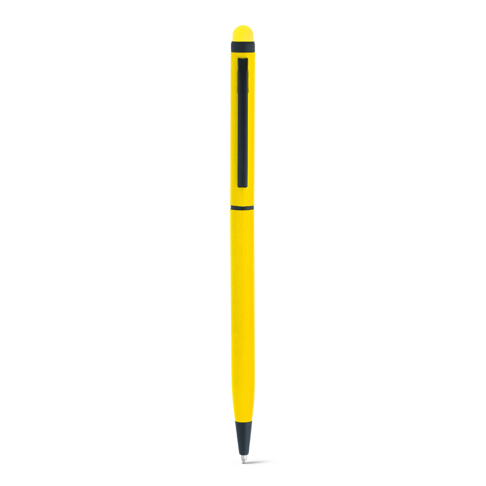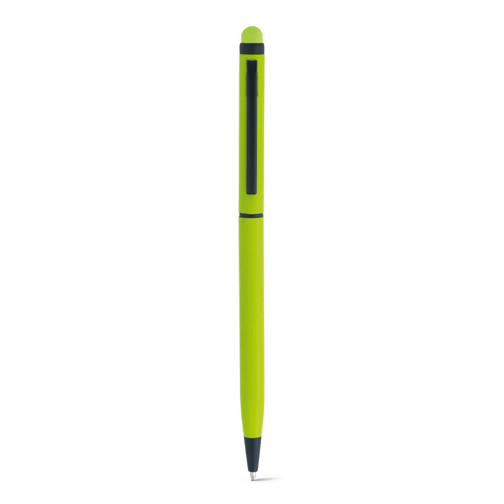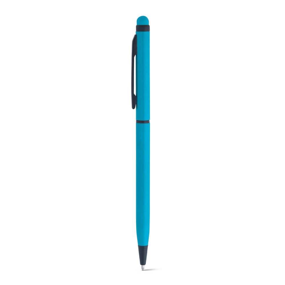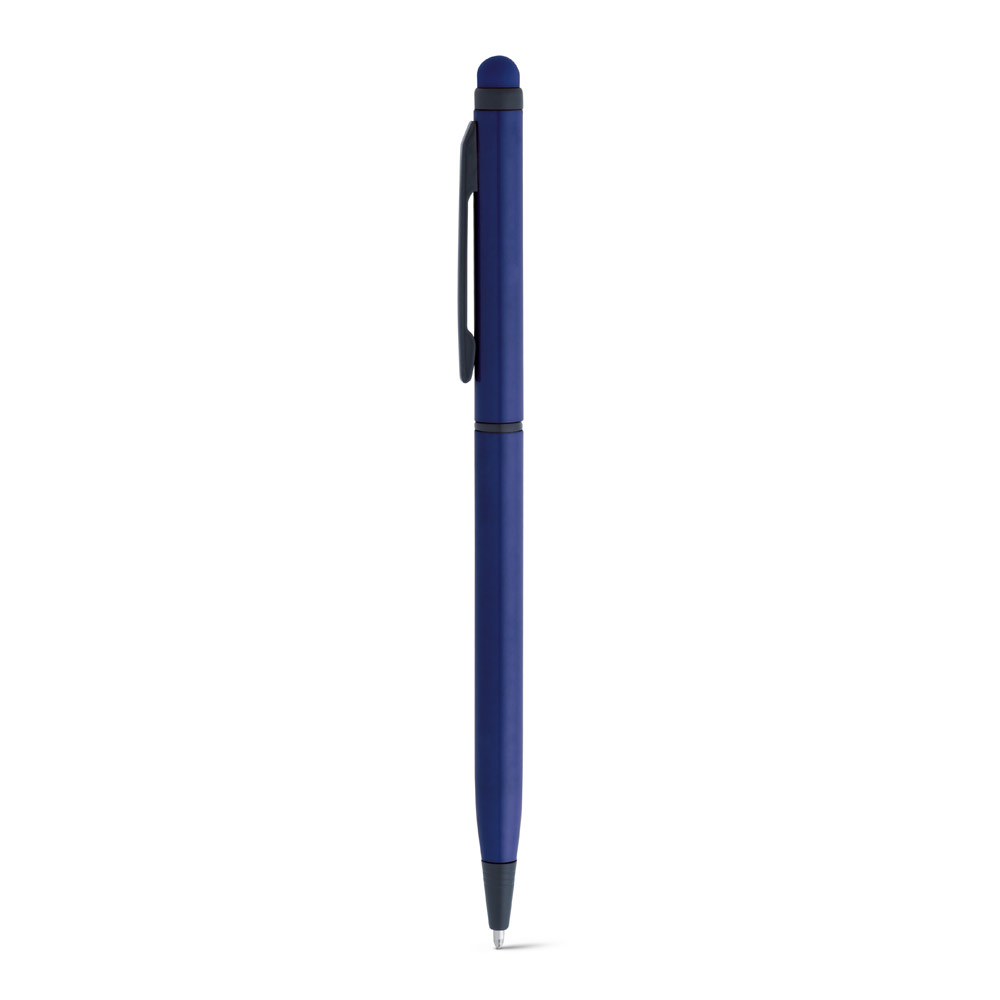 Esferográfica em alumínio com mecanismo twist, clipe de metal e ponteira touch. Escrita em azul até 1.5 km. ø8 x 137 mm
