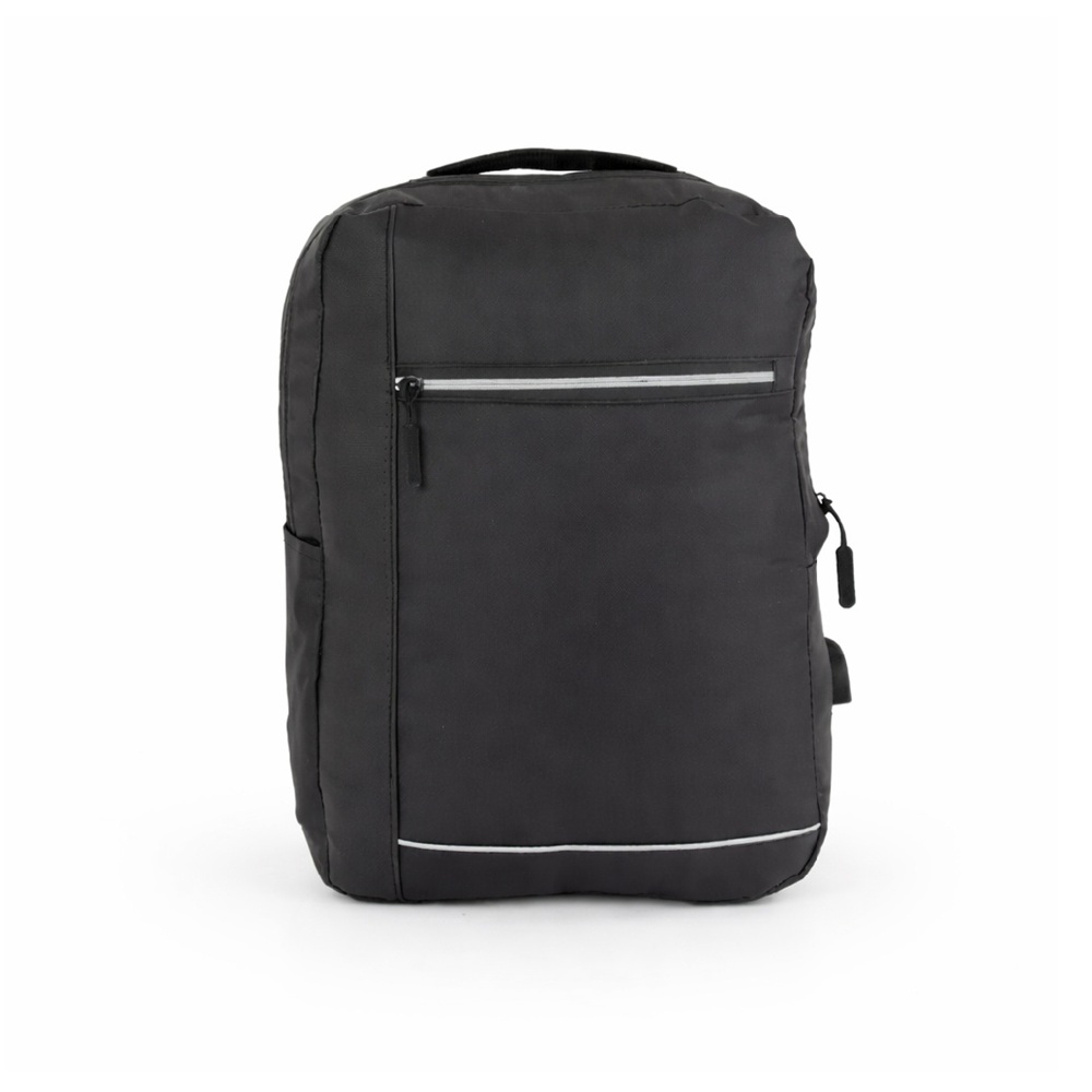 Mochila confeccionada em poliéster 300D resistente à água, com detalhes em couro sintético, fechamento em zíper e capacidade para até 15 litros. Possui compartimento principal com bolsos em diferentes tamanhos e divisória para notebooks de até 15.6 polegadas. Dispõe ainda de compartimento frontal com fechamento em zíper e faixa reflexiva, além de bolso lateral aberto e adaptador USB externo.