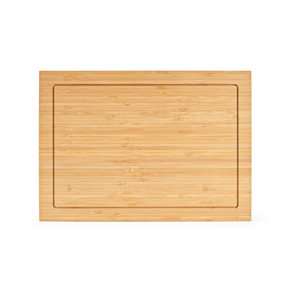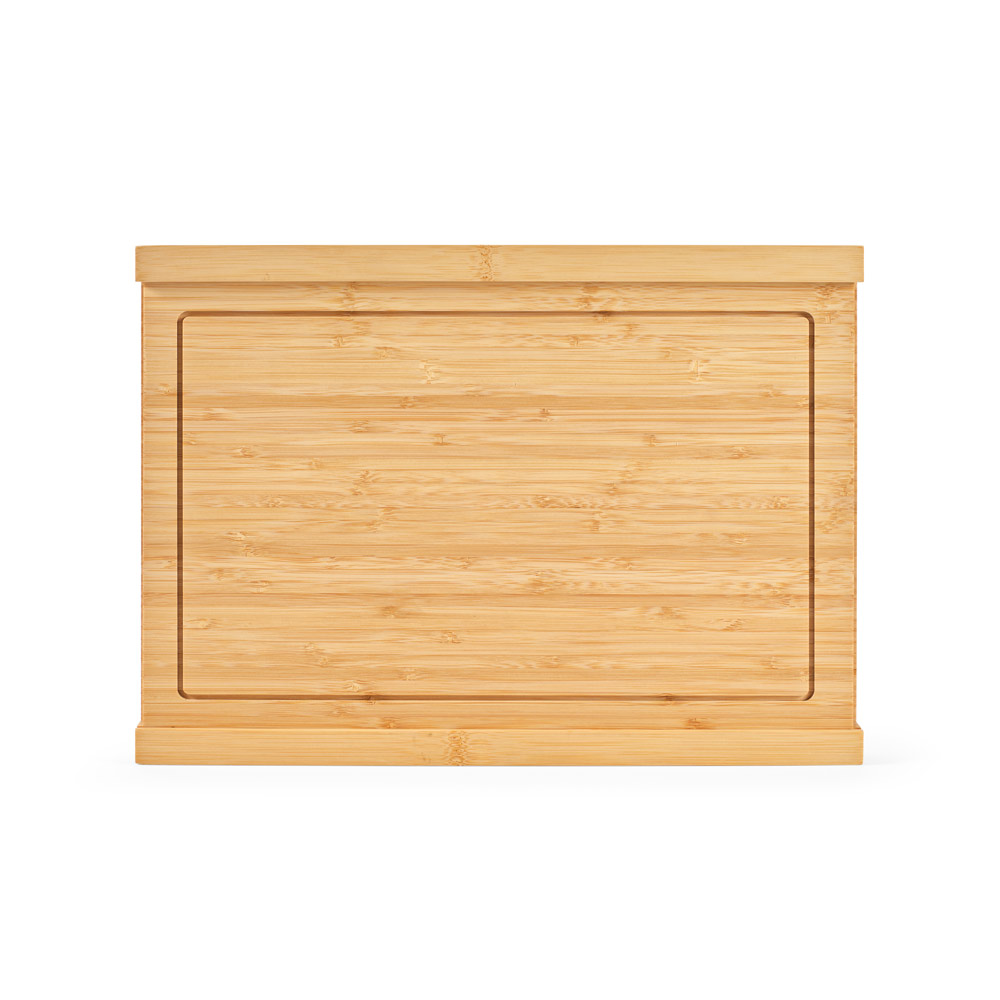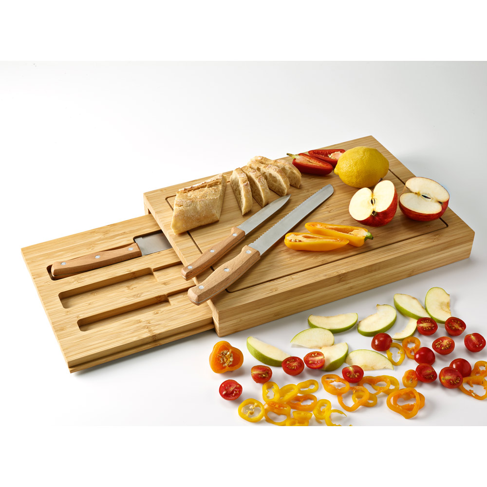 Conjunto de tábuas em bambu com 3 facas inclusas. Composto por duas tábuas: a tábua exterior e a tábua interior que assume duas funcionalidades – um compartimento para três facas inclusas (faca de legumes, faca de pão, faca de cozinha) e como tábua de corte. Fornecida em caixa presente de papel kraft reciclado. Certificação EU Food Grade. A cor e o resultado da impressão nos materiais naturais pode variar entre produtos. 390 x 280 x 45 mm | Tábua exterior: 390 x 280 x 15 mm | Tábua interior: 380 x 250 x 15 mm