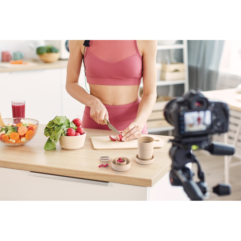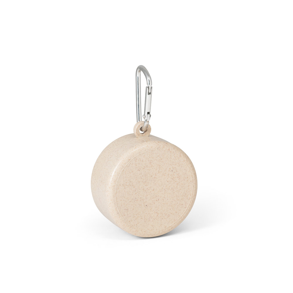 Copo de viagem retrátil em fibra de bambu (60%) e PP (40%) com capacidade até 210 mL. Incluso caixa para comprimidos e mosquetão. Certificação EU Food Grade. ø65 x 33 mm