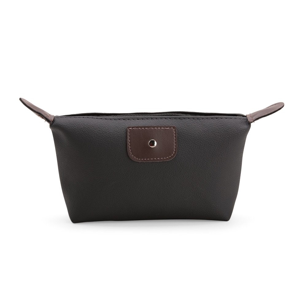 Nécessaire em couro sintético impermeável e fechamento em zíper e detalhe frontal metálico.