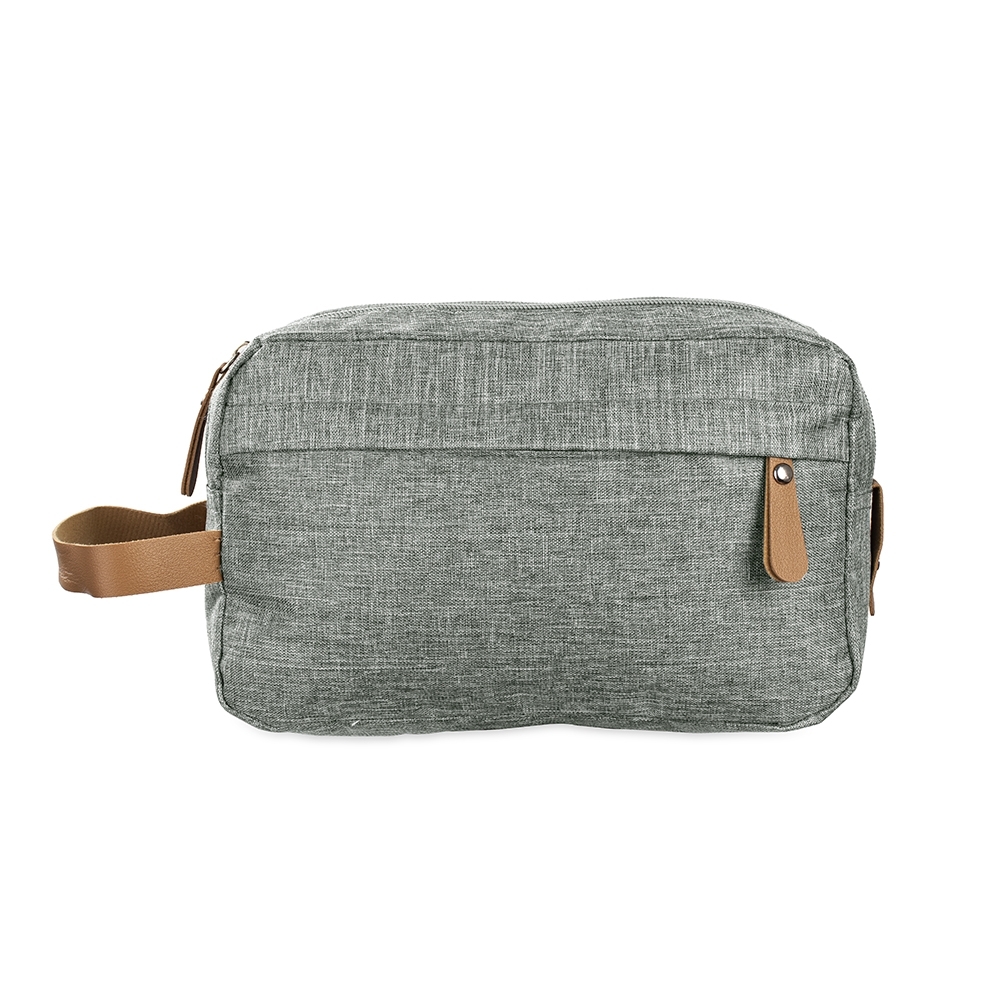 Nécessaire em poliéster 300D catiônico resistente à água com alça de mão lateral e puxadores de zíper em couro sintético. Possui dois compartimentos com revestimento em poliéster 210D, sendo um deles com cinco bolsos de diferentes tamanhos, incluindo dois em tela. Conta também com dois bolsos externos de tamanhos variados e fechamento em zíper.