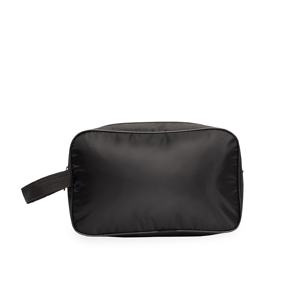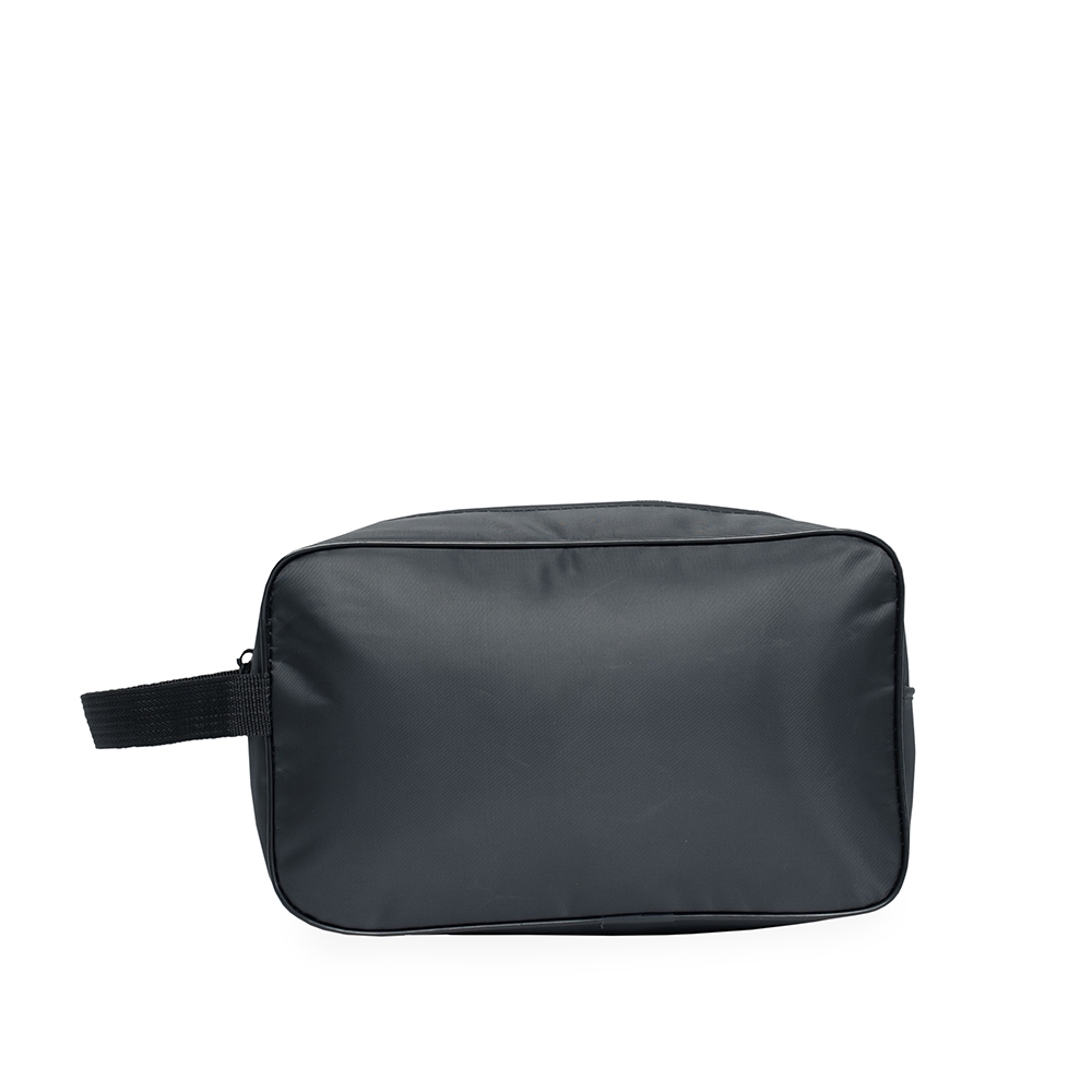Nécessaire impermeável em poliéster com revestimento em PVC, fechamento em zíper e alça de mão em nylon.