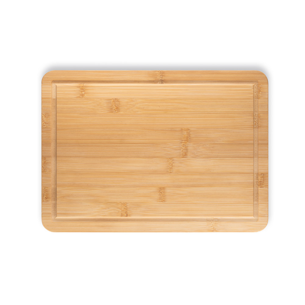 Tábua de corte em bambu, com ranhura para líquidos.. Certificação EU Food Grade. A cor e o resultado da impressão nos materiais naturais pode variar entre produtos. 350 x 250 x 12 mm