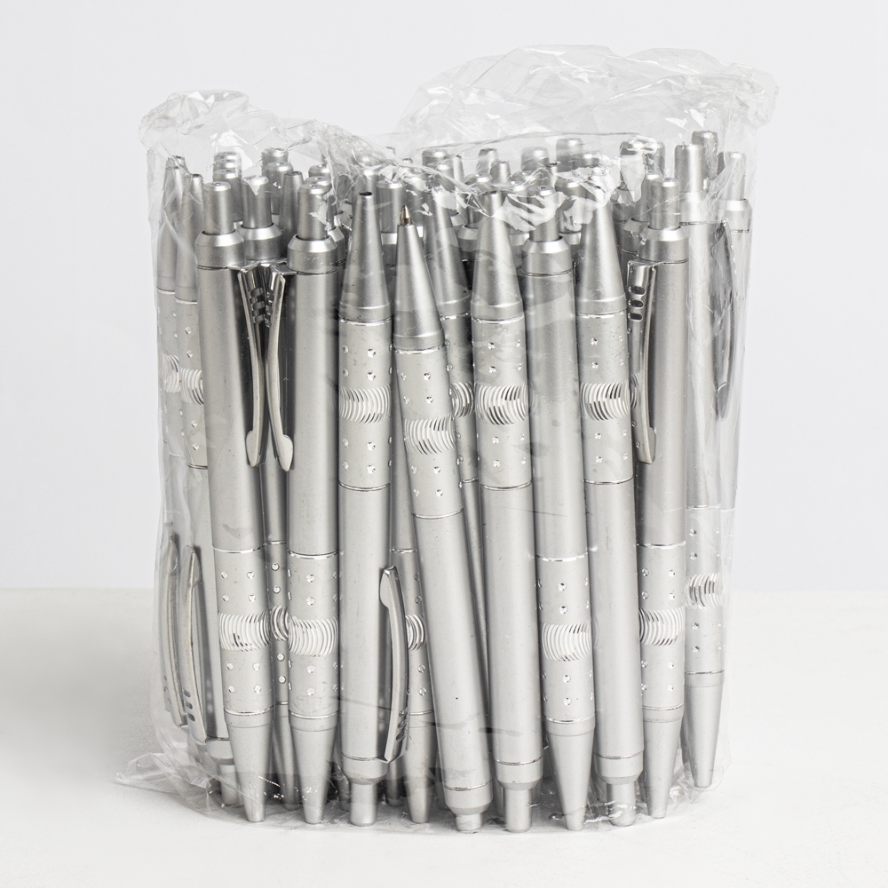 Pacote com 50 peças da caneta plástica com detalhe strass, carga esferográfica azul e acionamento por clique.