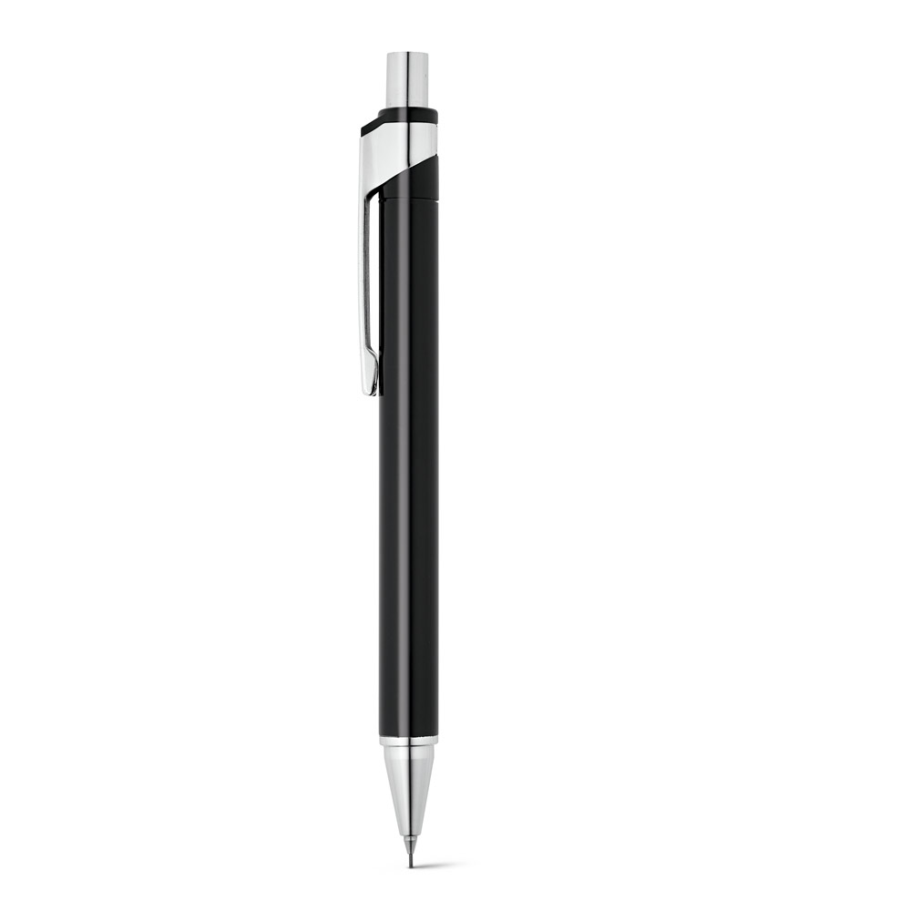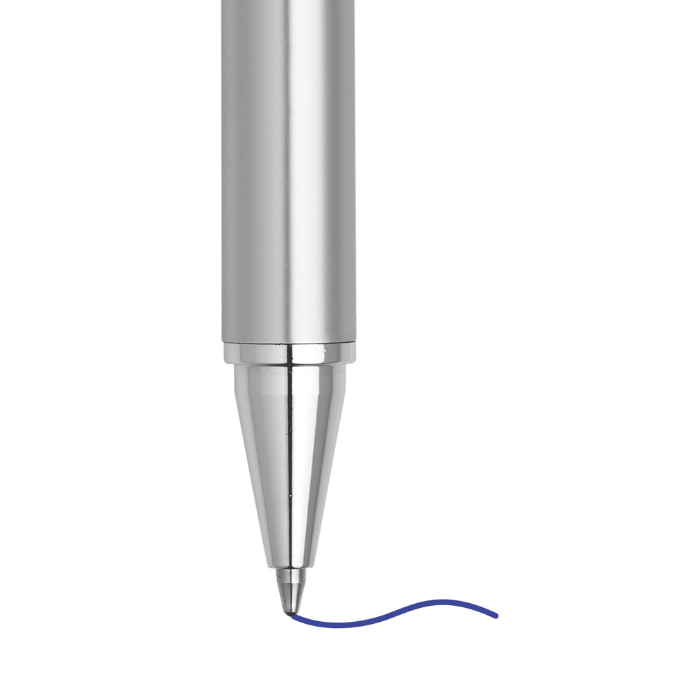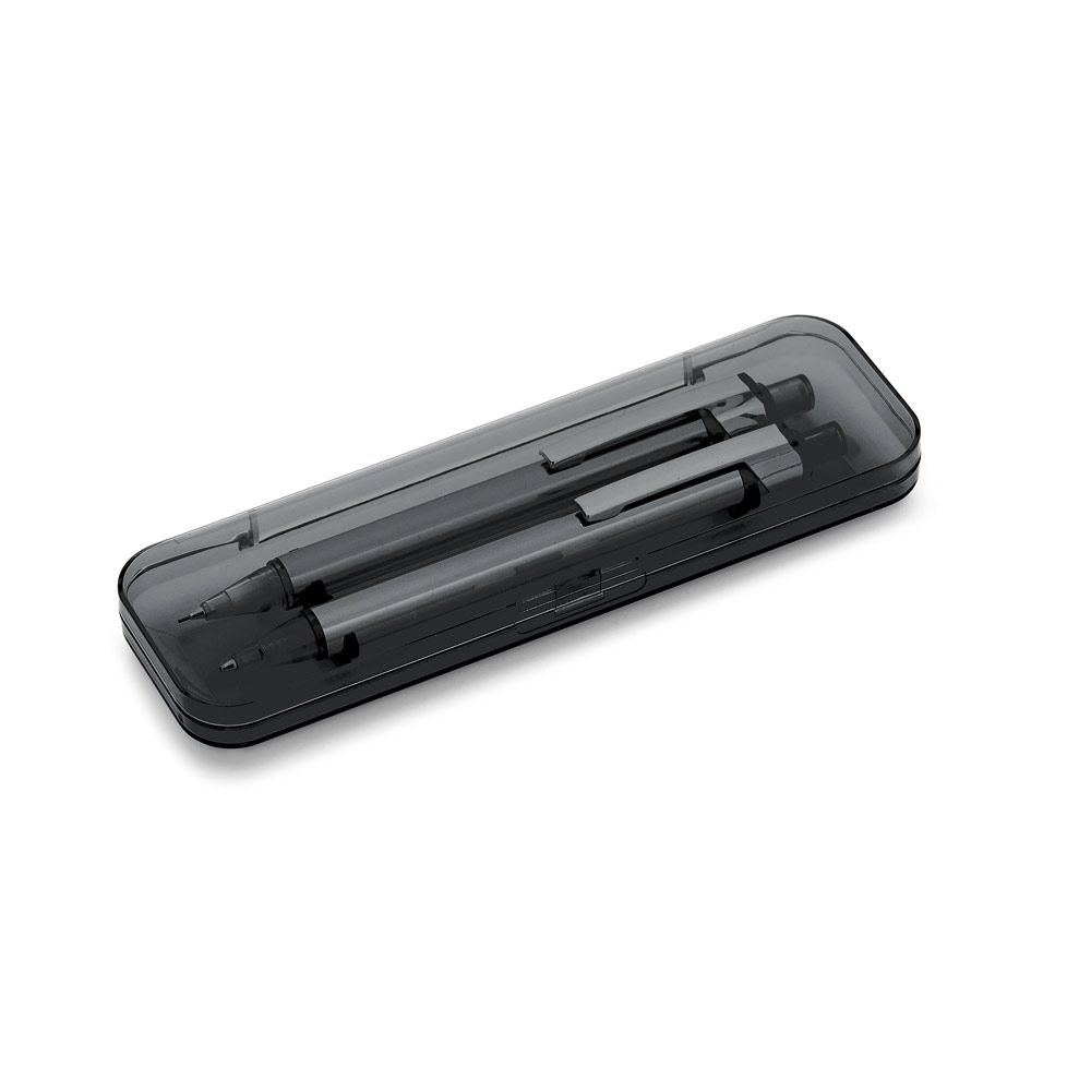 Conjunto de esferográfica e lapiseira em alumínio. Escrita em azul até 1.5 km. Lapiseira com grafite 0’5 mm. Incluso estojo. ø11 x 137 mm | Estojo: 165 x 50 x 24 mm