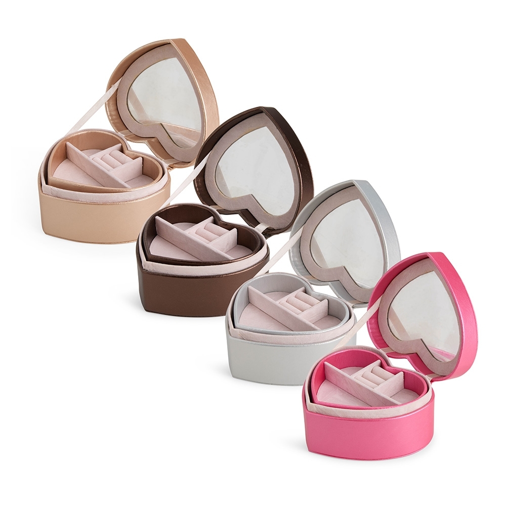 Porta-joias em couro sintético com formato de coração e revestimento interno aveludado. Conta com espelho interno e dois compartimentos principais: o superior, removível, com quatro divisórias em diferentes tamanhos, uma delas com almofadas para abrigar anéis e brincos; e o inferior, com mais quatro divisórias.