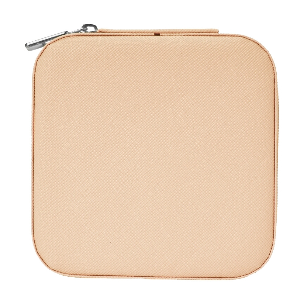 Porta-joias quadrado em couro sintético com revestimento interno em tecido aveludado. Possui bolso elástico e três ganchos pequenos na parte interna da tampa, além de divisória multiuso e repartição almofadada com ranhuras para anéis, ambos localizadas no compartimento principal.