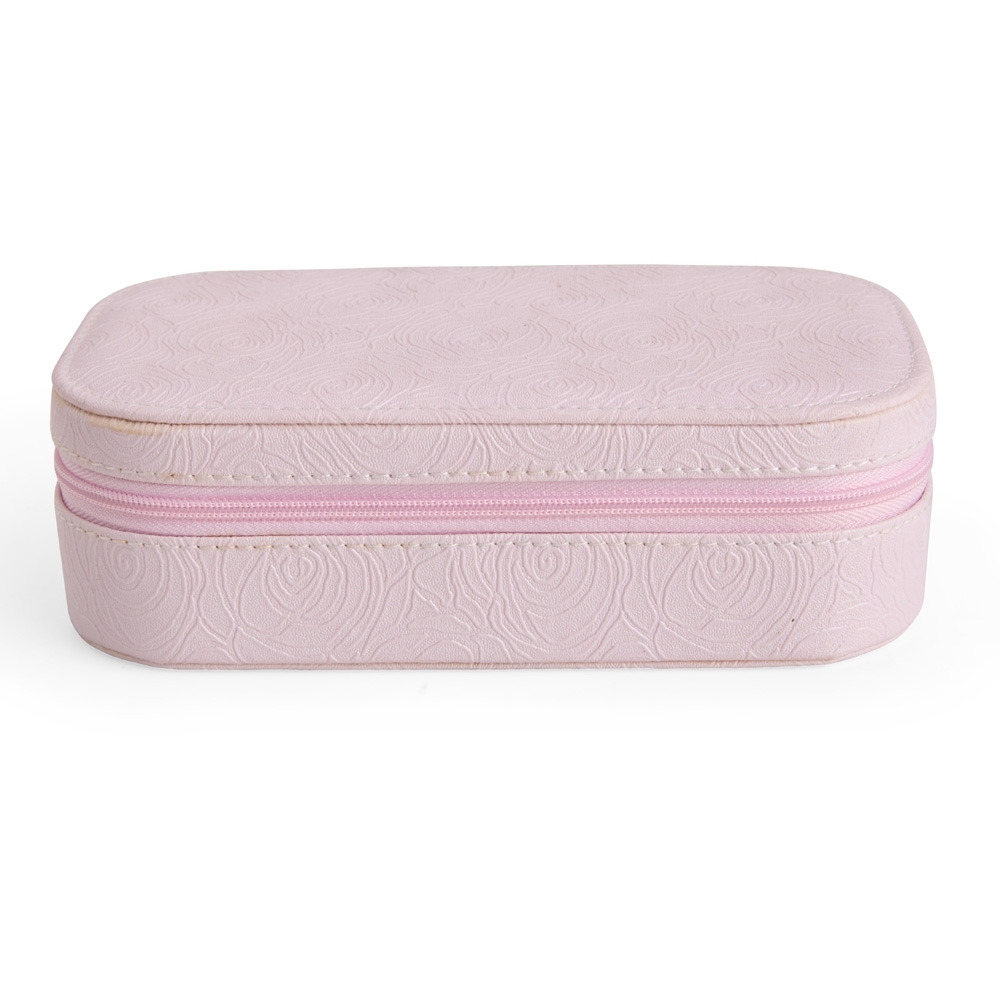 Porta-joias em couro sintético e fechamento em zíper com puxador que remete ao formato da torre Eiffel. Possui revestimento interno aveludado, espelho retangular fixo, dois ganchos e bolso posicionados na parte interna da tampa, além de divisórias removíveis no compartimento principal e outra com almofadas para anéis e brincos.