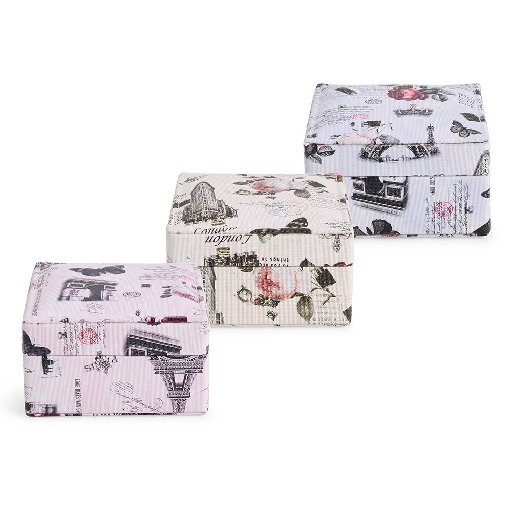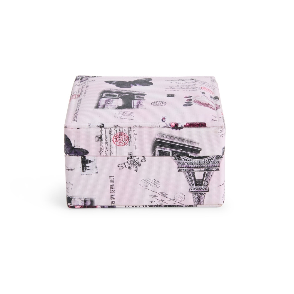 Porta-joias em tecido sintético levemente texturizado e revestimento interno em veludo. Conta com espelho fixo no interior da tampa e um compartimento com três divisórias, uma delas com almofadas para anéis e brincos.