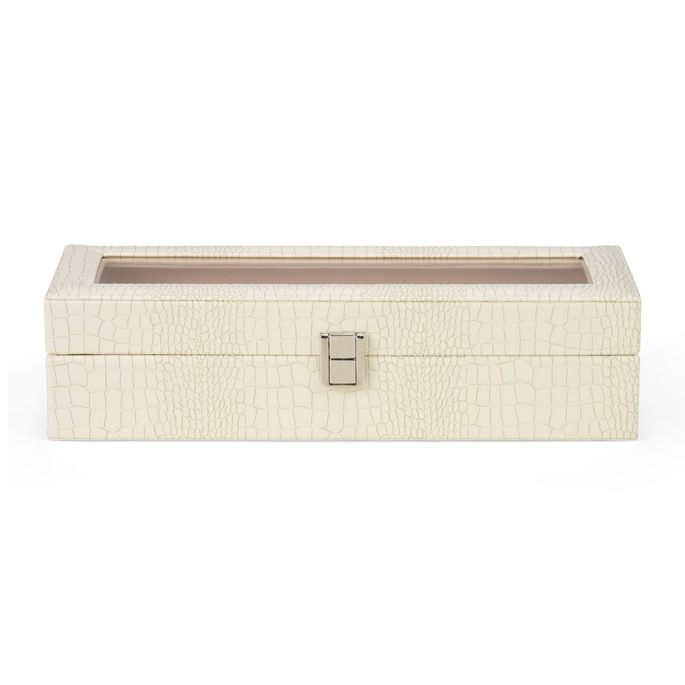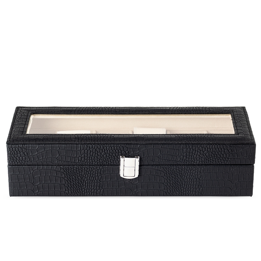 Porta-relógios com aacabamento texturizado em couro sintético à base de PVC e revestimento interno em veludo. Conta com seis divisórias com almofadas removíveis, visor em vidro e trava de segurança na tampa.