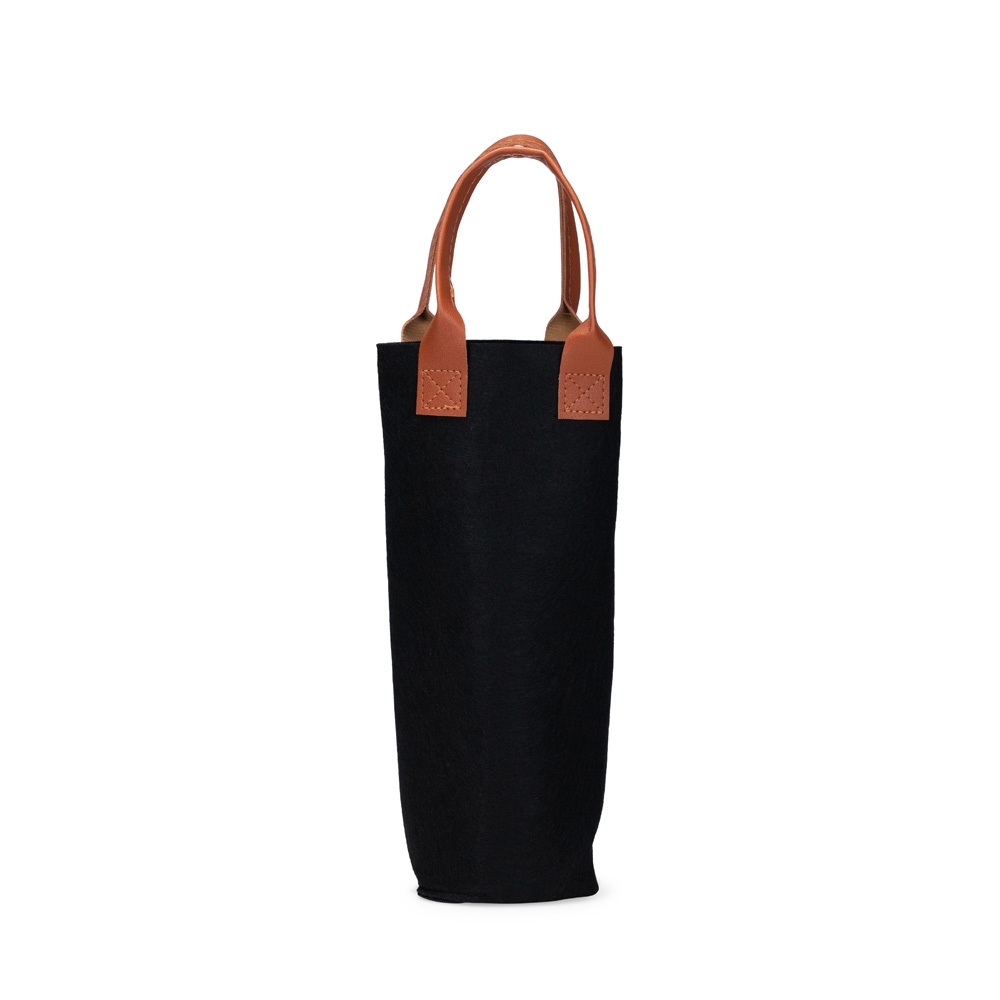Sacola porta-vinho confeccionada em feltro e alças de mão em couro sintético.