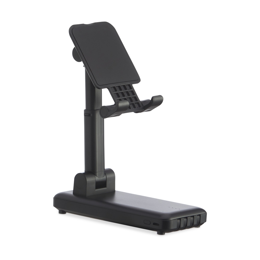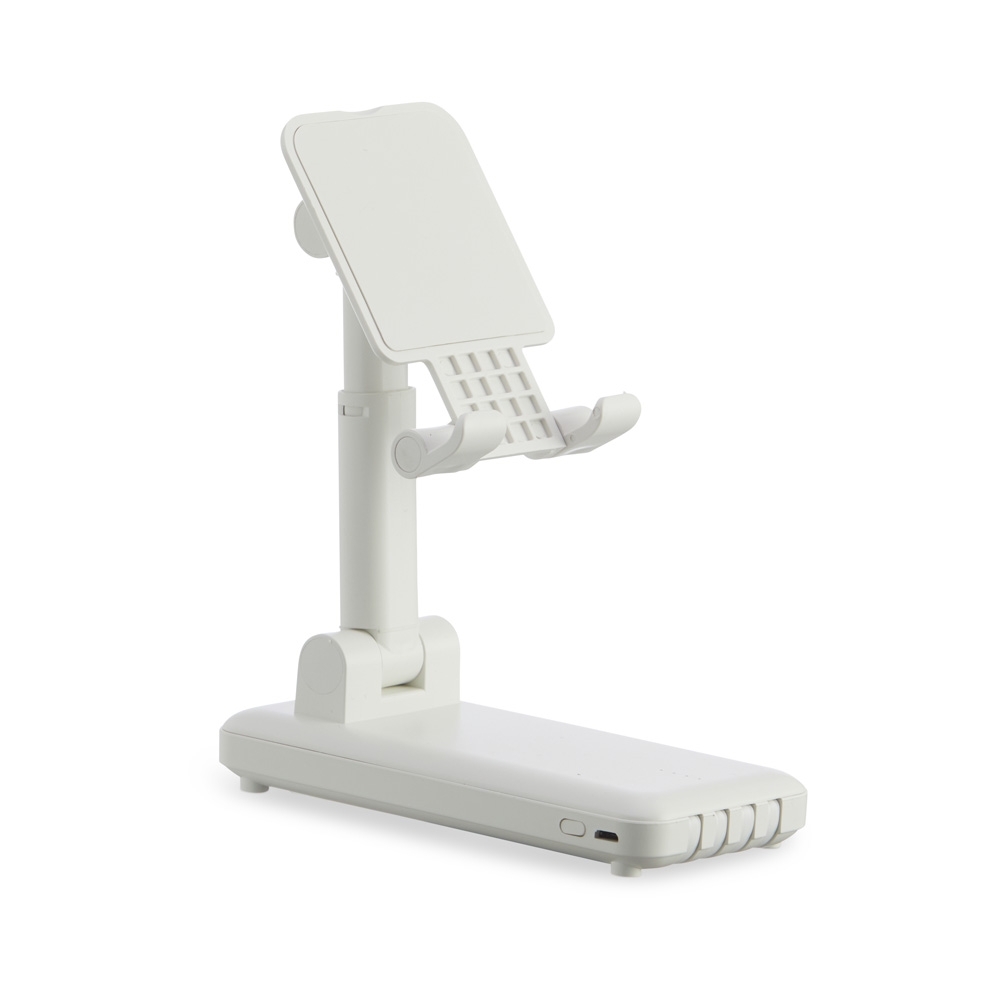 Power bank plástico de 10.000mAh multissaídas com suporte retrátil para celular ou tablet. Com indicadores led de bateria e base antiderrapante, o carregador possui os cabos tipo-C , lightning, , V8 e USB acoplados. Acompanha cabo USB V8 e adaptador lightning.