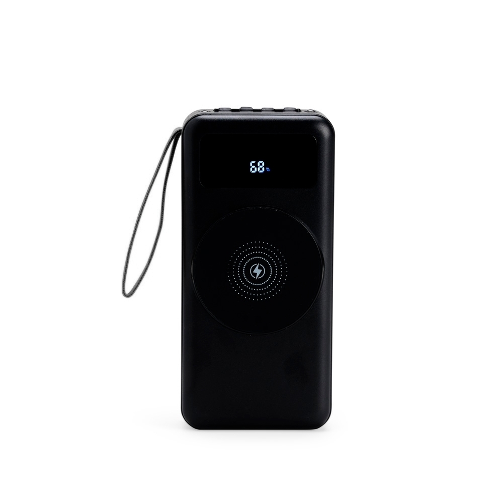Power bank em plástico com capacidade de 20.000mAh, painel de LED que indica o percentual de bateria, alça em couro sintético para transporte e suporte lateral que permite apoiar aparelhos na horizontal. Possui quatro cabos acoplados, incluindo: USB-C, Micro USB, Lightning e Cabo USB, além de espaço reservado para carregamento por indução de aparelhos compatíveis. Dispõe ainda de conexões USB-C, Micro-USB e USB para recarga do próprio dispositivo.