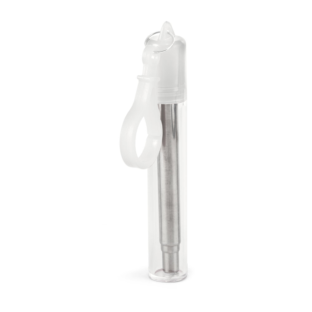 Conjunto de canudo em aço inox e escova de limpeza. Fornecido em estojo com mosquetão. Certificação EU Food Grade. Canudo: ø9 x 218 mm | Estojo: ø10 x 105 mm