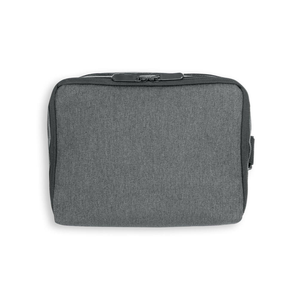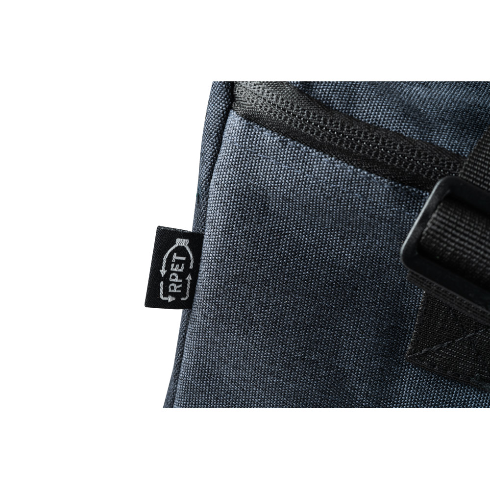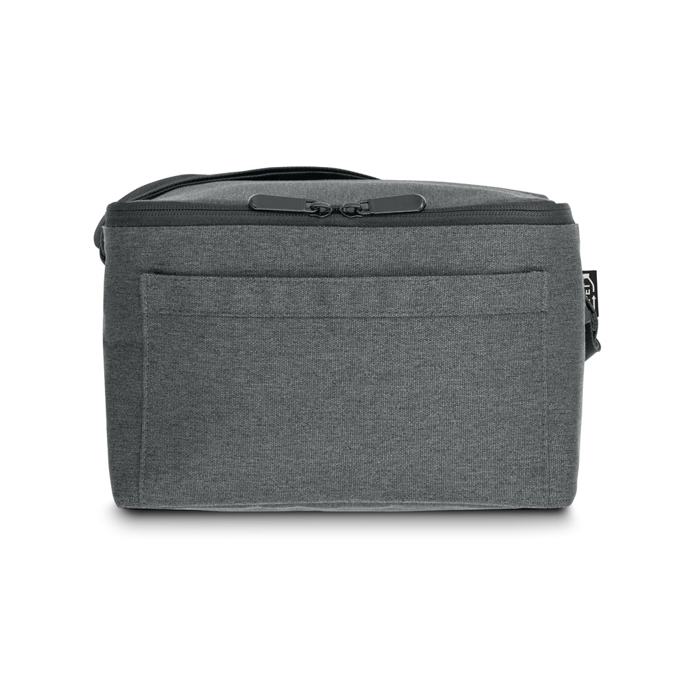 Bolsa térmica em poliéster reciclado 600D com interior em PEVA. Alça ajustável em webbing, bolso frontal e fecho duplo. Capacidade até 6 L. Certificação EU Food Grade. 240 x 170 x 170 mm
