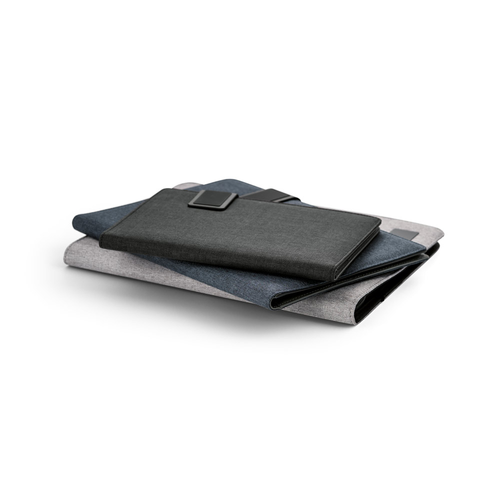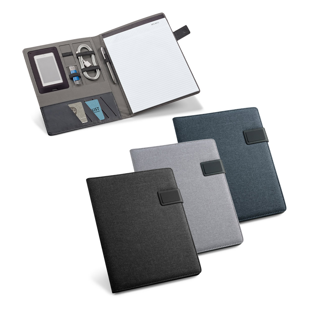Pasta A4 em linho sintético e c. sintético com fecho magnético. O interior contém um caderno de 40 páginas pautadas, suporte para esferográfica (não inclusa), bolso para smartphone e suportes para cabos ou outros acessórios (não inclusos). Placa metálica com acabamento emborrachado. 233 x 310 x 18 mm | Placa: 50 x 30 mm