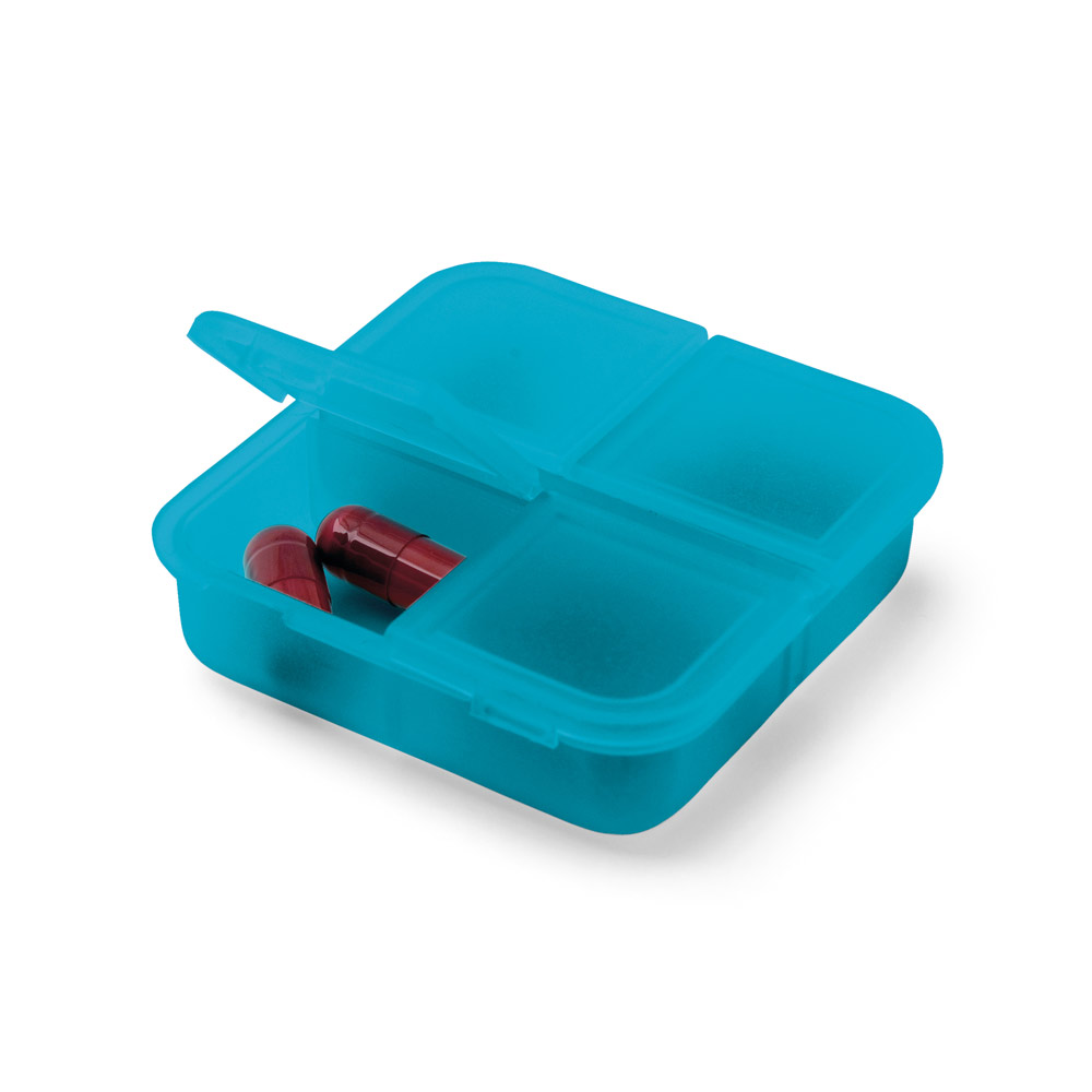 Porta comprimidos com 4 divisórias com tampa, disponível em várias cores. Certificação EU Food Grade. 60 x 60 x 18 mm