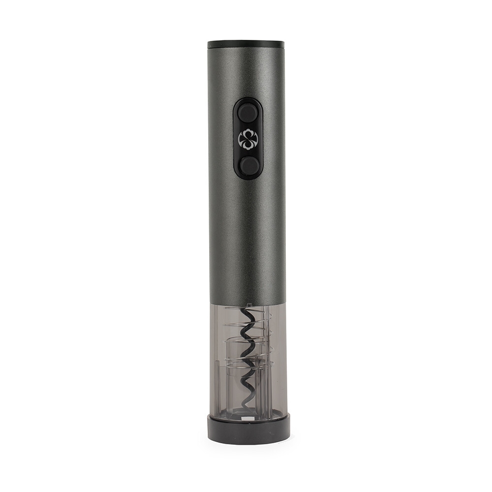 Saca-rolhas elétrico com estrutura em ABS, policarbonato e inox, além de painel com iluminação em LED e botões emborrachados. Funciona com quatro pilhas AA (não inclusas) e acompanha cortador de lacre.
