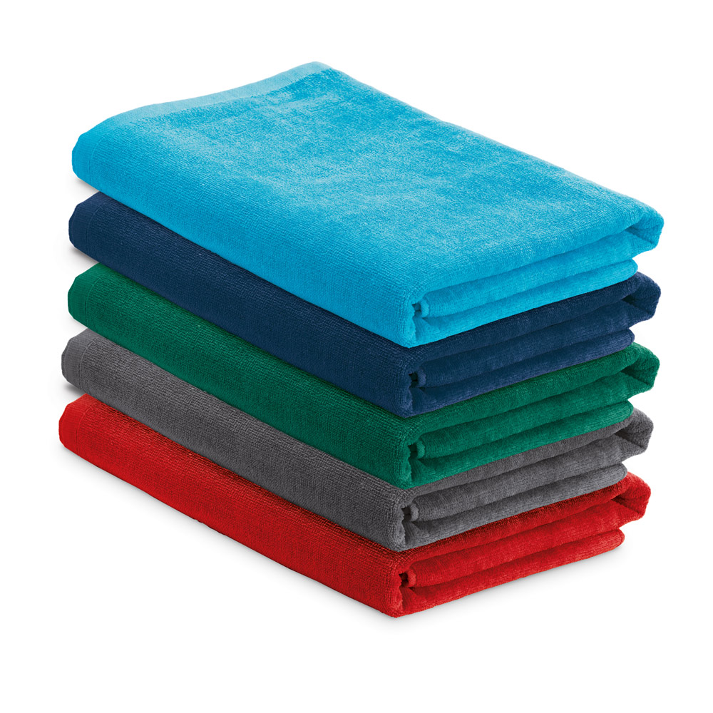 Toalha de praia em veludo de algodão (320 g/m²), disponível em várias cores. Fornecida com sacola em non-woven (80 g/m²). 1500 x 750 mm | Sacola: 330 x 415 x 100 mm