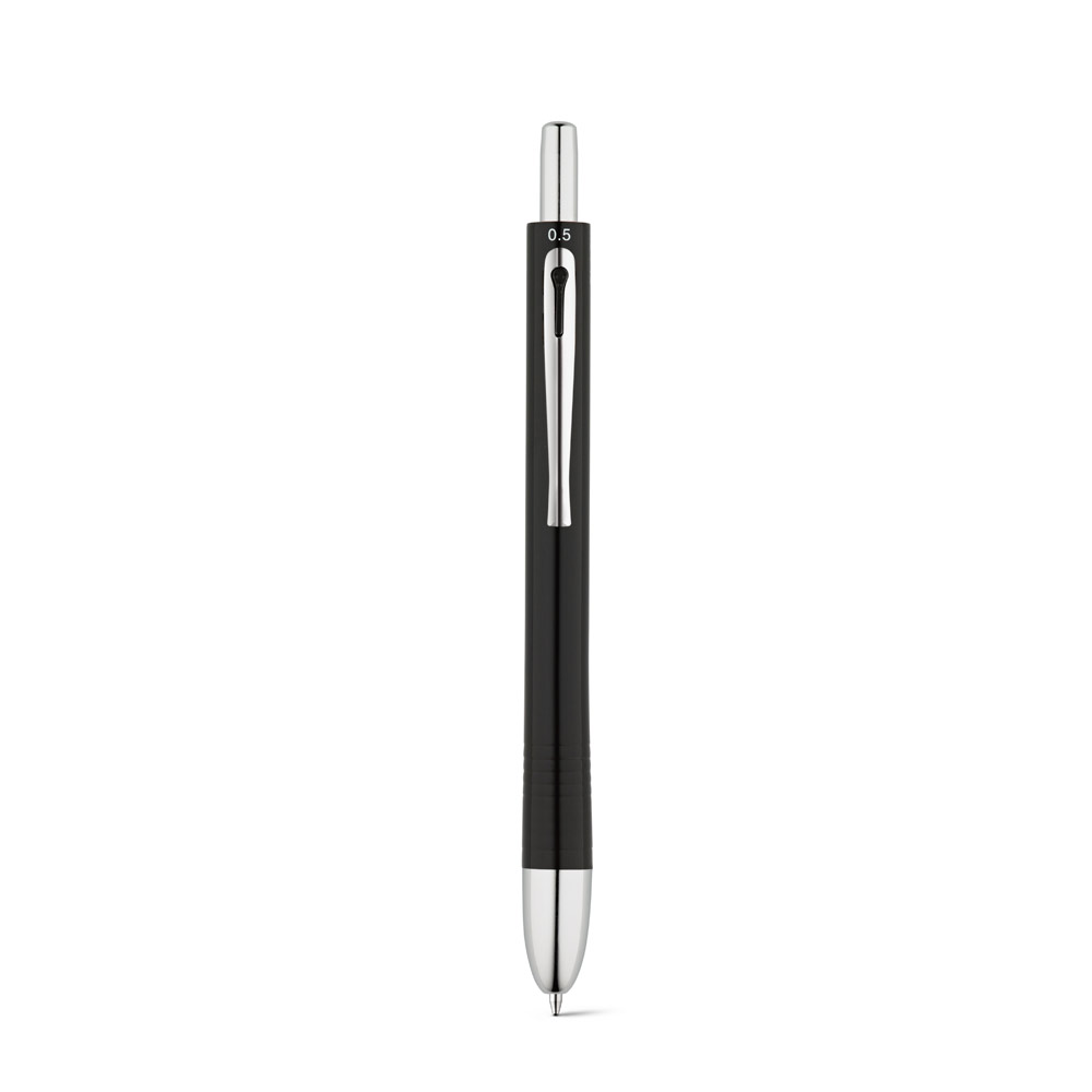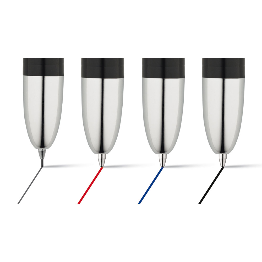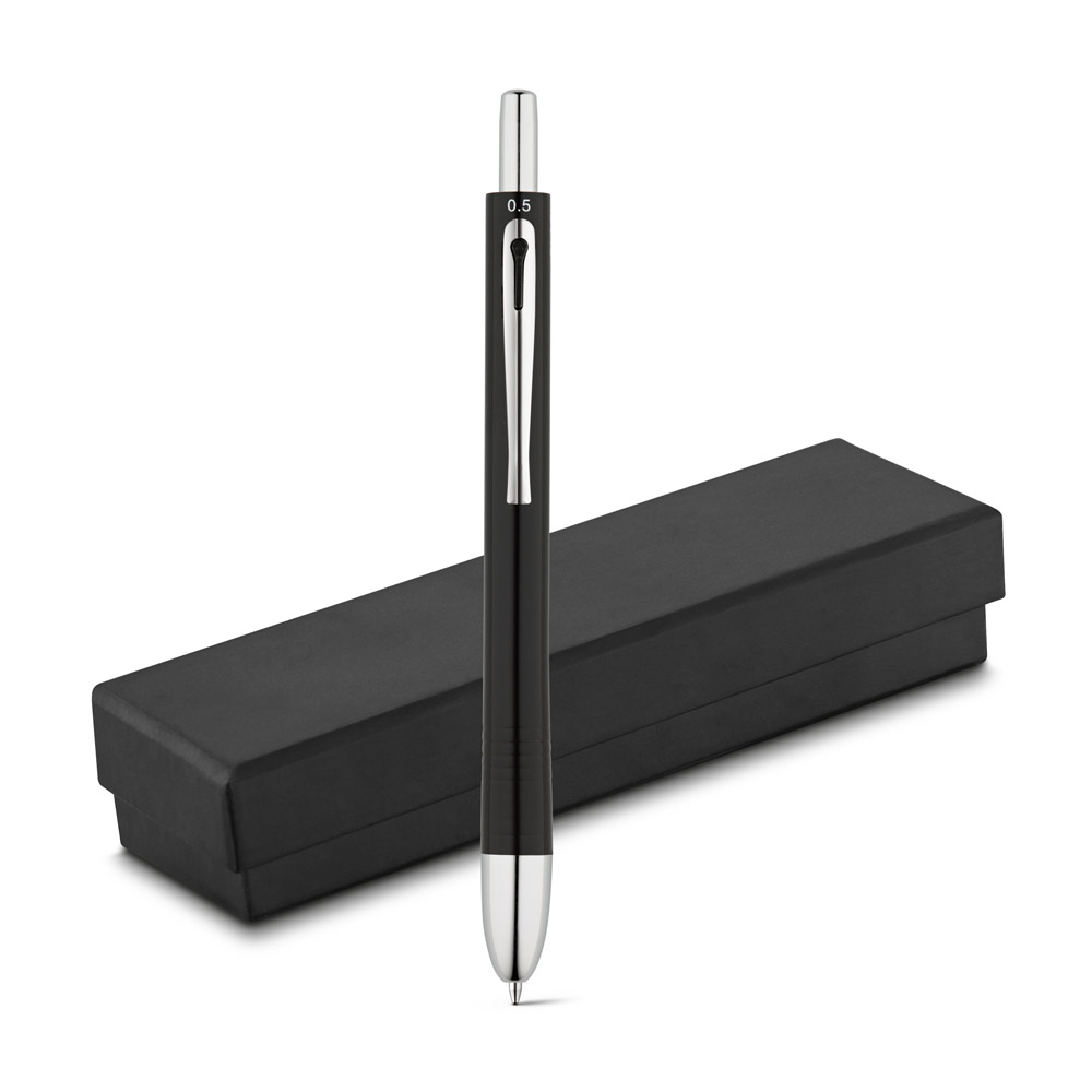 Esferográfica multifunções em metal com diferentes possibilidades de escrita: lapiseira com grafite 0.5 mm, escrita a vermelho, azul ou preto. Esferográfica até 2 km de escrita. Fornecida em estojo almofadado. ø10 x 132 mm | Estojo: 150 x 43 x 24 mm