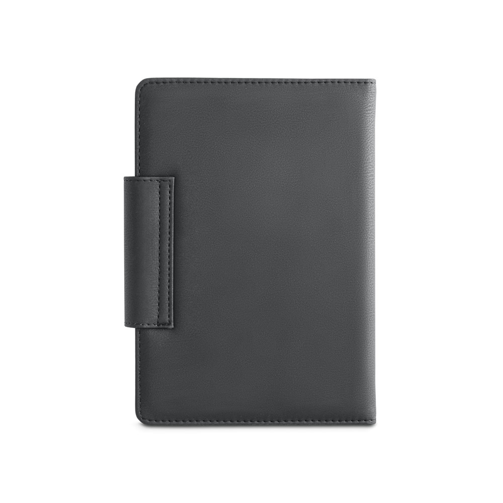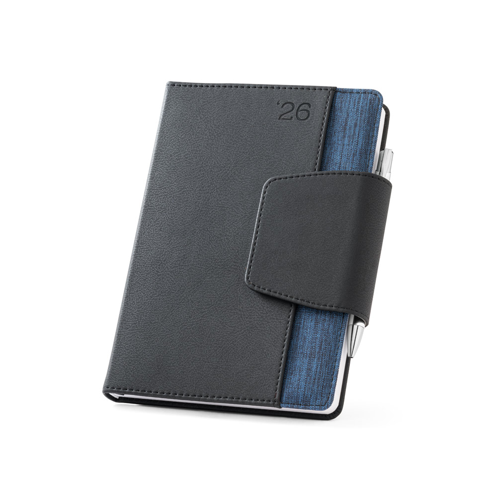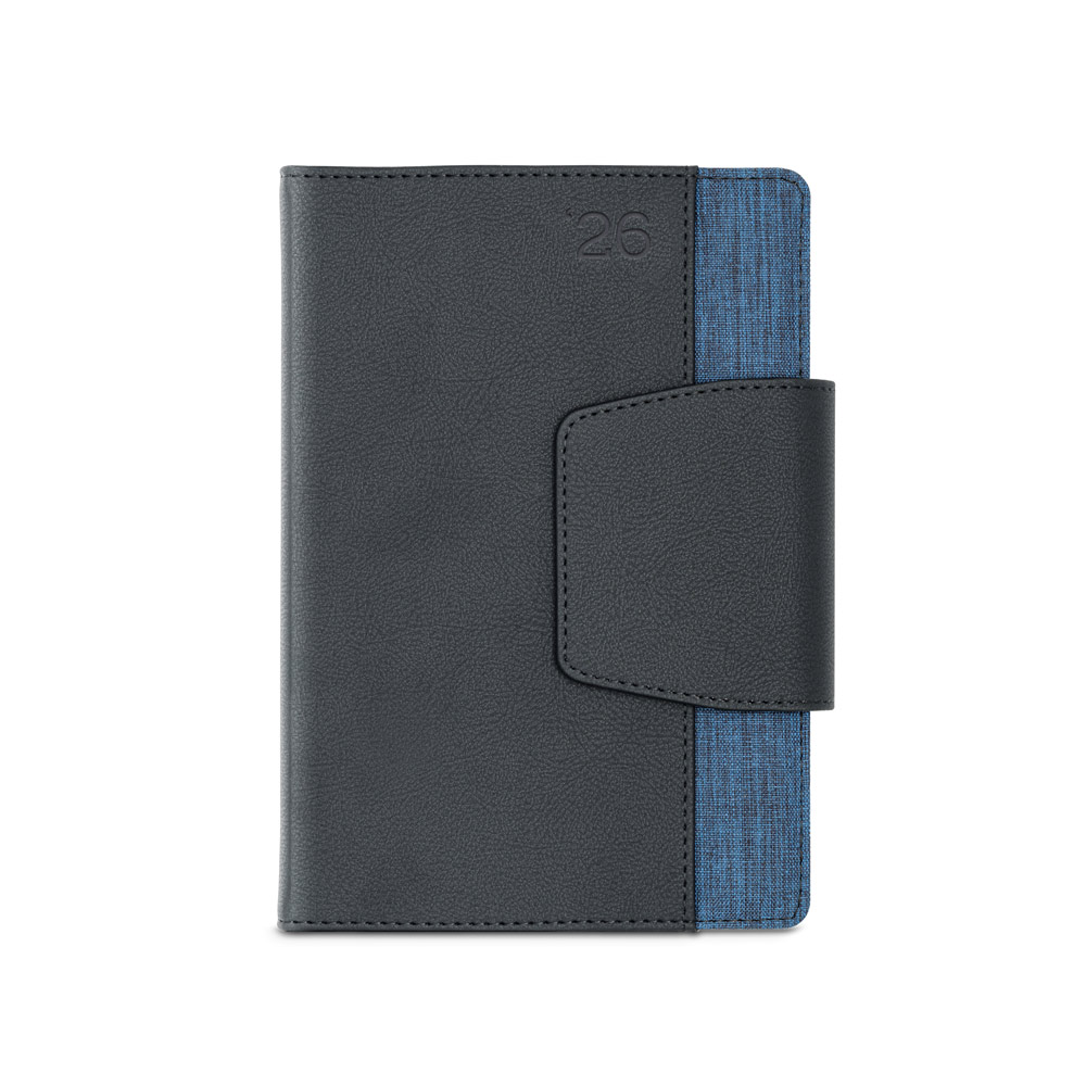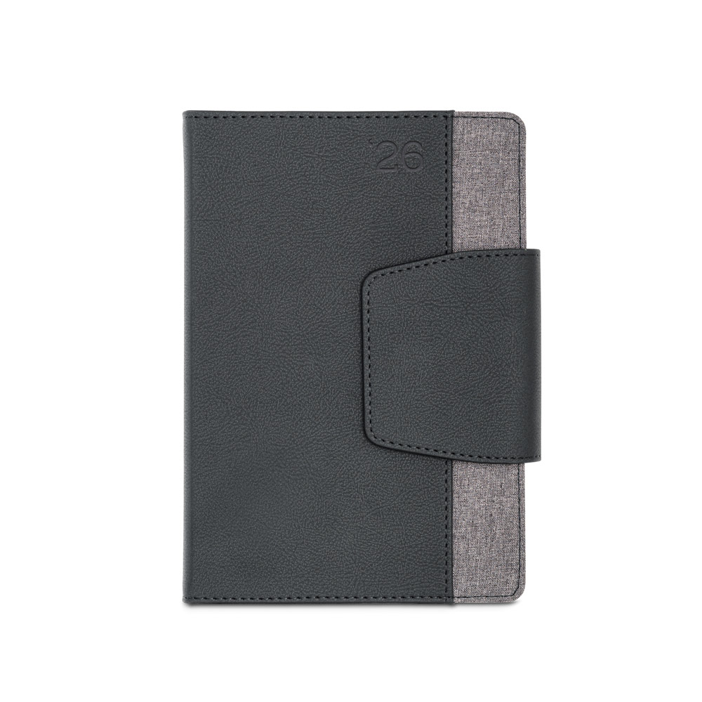 Agenda A5 em PU e tecido em poliéster. Possui fecho magnético, bolso frontal, suporte para esferográfica (inclusa) e marcador em fita. Está organizada num plano diário (70 g/m²). Fornecida com bolsa de non-woven. 148 x 210 mm | Bolsa: 205 x 250 mm