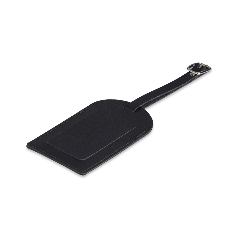 Tag identificador de bagagem em couro sintético. Parte frontal com abertura para visor plástico e verso liso, possui fivela regulagem.