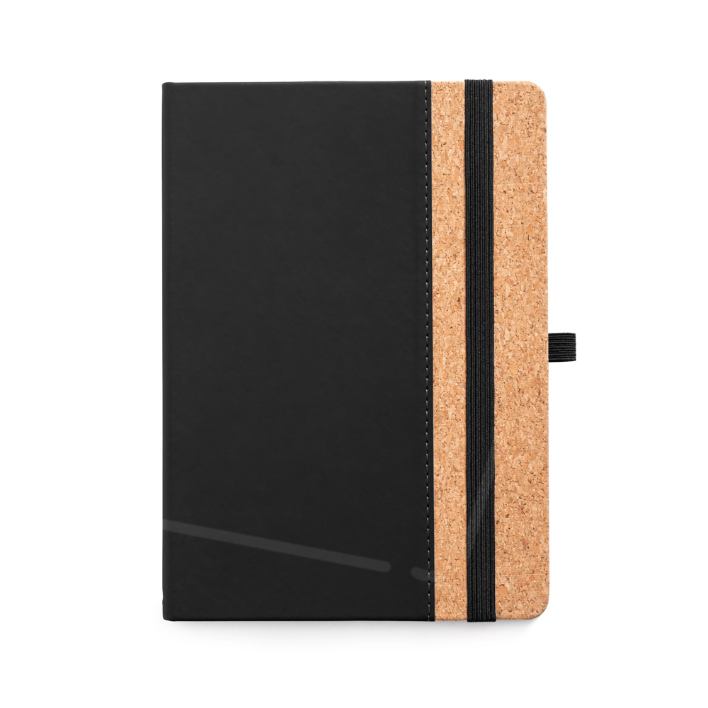 Caderno A5 com capa dura em cortiça e PU e 192 páginas pautadas em cor marfim. Contém elástico, fita separadora e suporte para esferográfica (não inclusa). Fornecido em bolsa de non-woven. 140 x 210 mm