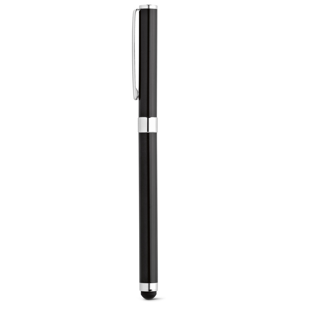 Roller em aço inoxidável com corpo brilhante e detalhes em metal cromado. O detalhe da ponteira touch torna este brinde sofisticado e adaptável às novas tecnologias. Escrita em preto. Fornecido com caixa presente desmontada. ø9 x 141 mm | Estojo: 150 x 15 x 19 mm