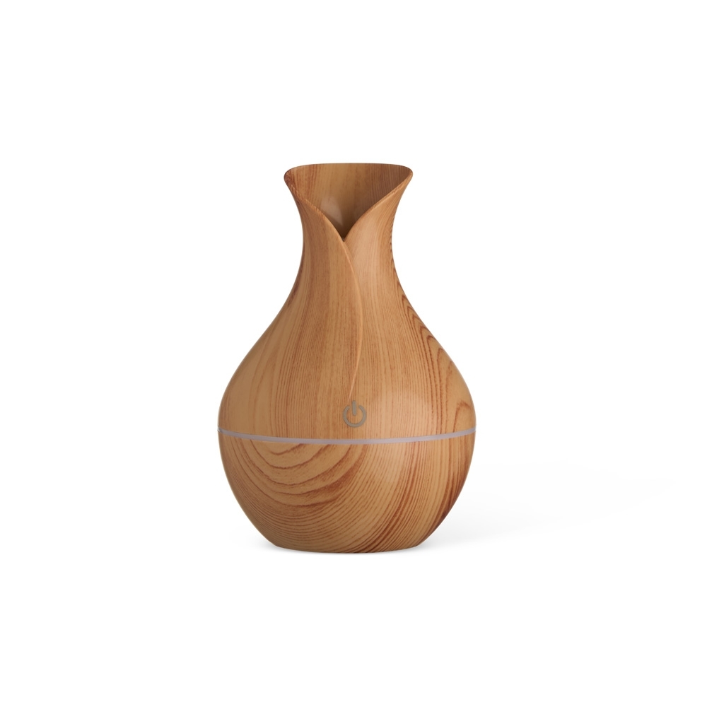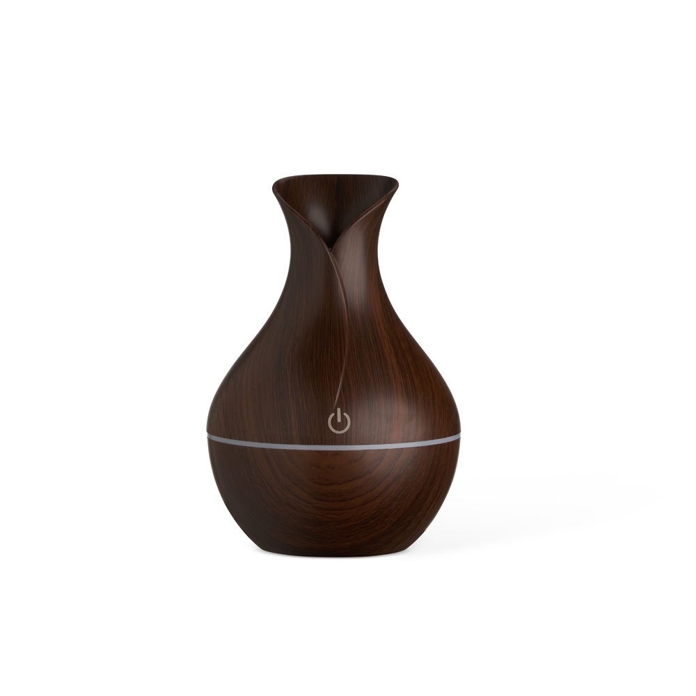 Umidificador com led de 7 cores com exibição alternada. Produzido em plástico estilizado em madeira com acabamento brilhante. Umidificador possui capacidade de até 150ml e funciona apenas a base de água. Acompanha filtro de algodão e um cabo USB. Obs.: A limpeza externa deve ser feita apenas com pano umedecido, caso submergir o produto o equipamento pode ser danificado.