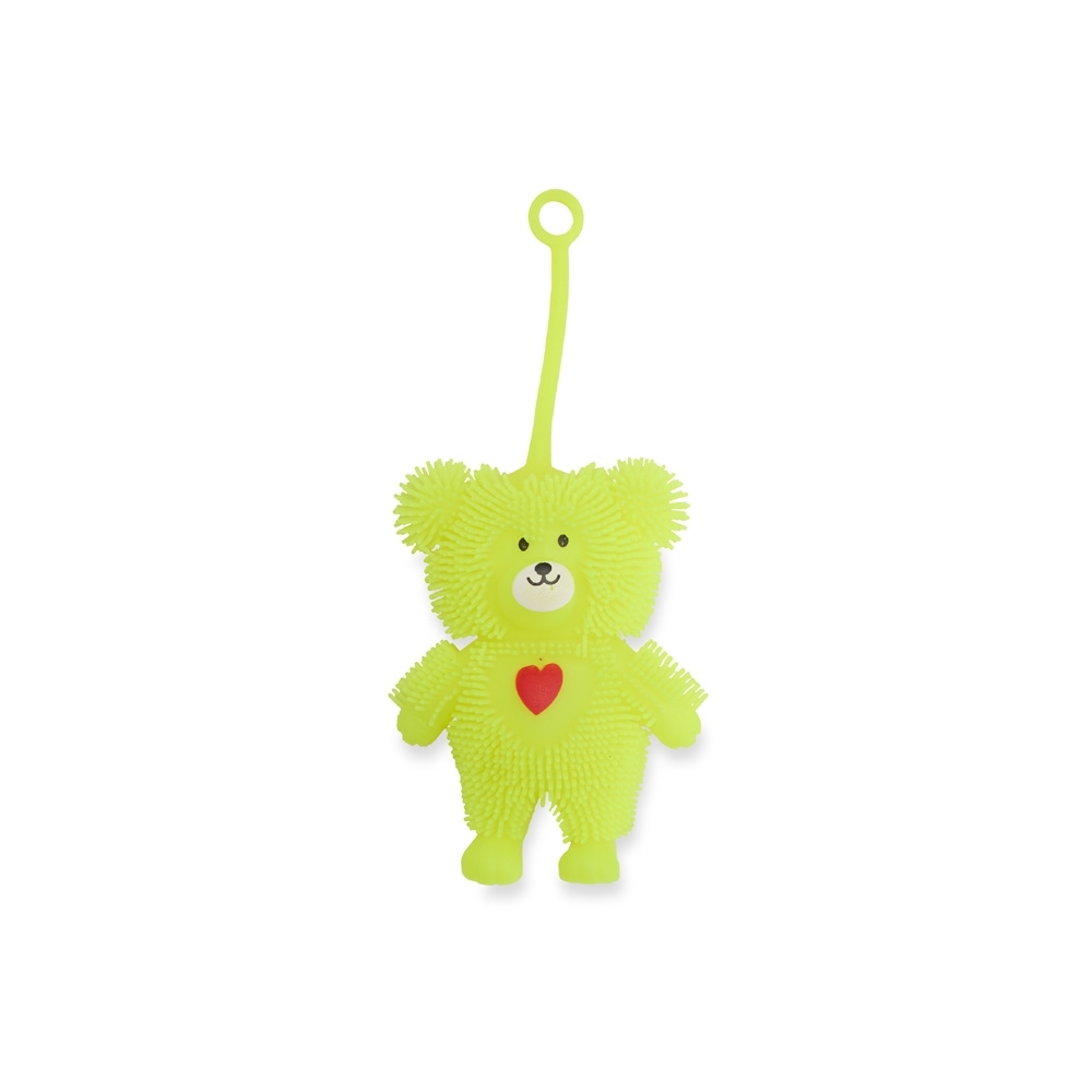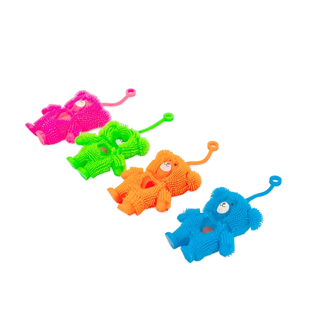 Ursinho antiestresse feito em silicone e borracha com textura macia, que pode ser apertado e esticado com facilidade. Conta com franjas espalhadas pelo corpo, uma corda para uso como ioiô e luz interna que acende quando tocada.