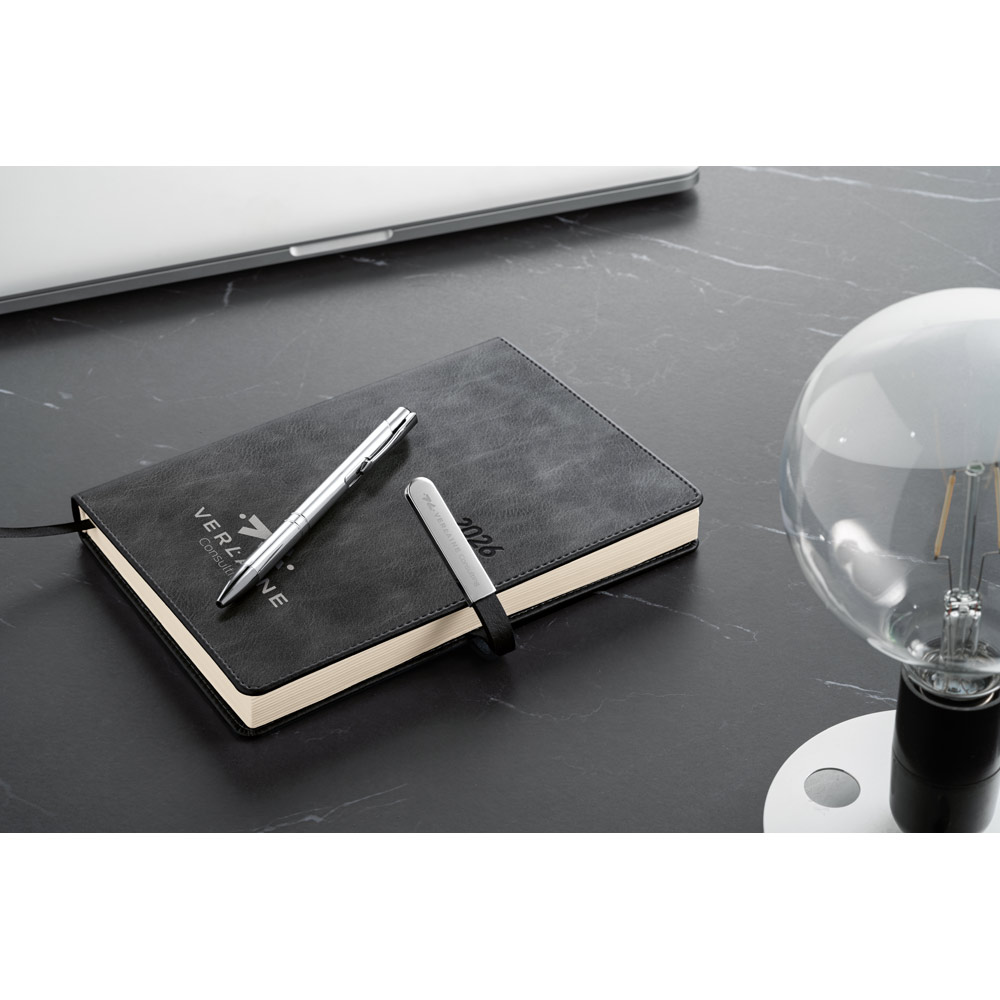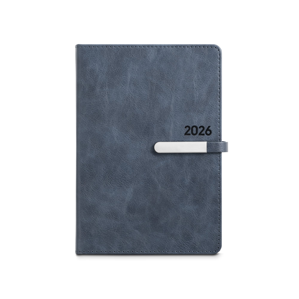 Agenda A5 em PU, com fecho magnético e peça metálica brilhante. Possui um suporte para esferográfica (inclusa) e marcador em fita. Está organizada num plano diário. Fornecida com bolsa de non-woven. 148 x 210 mm | Bolsa: 205 x 250 mm