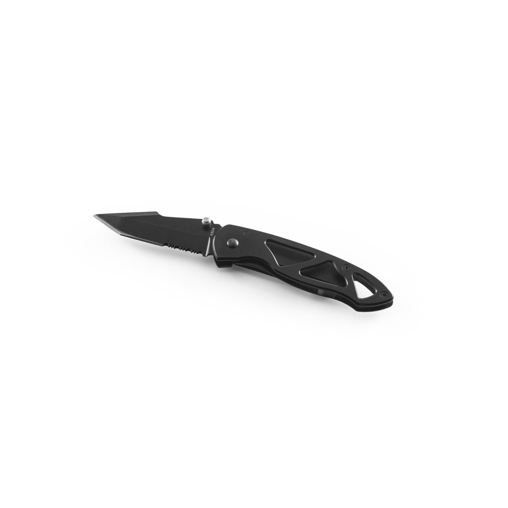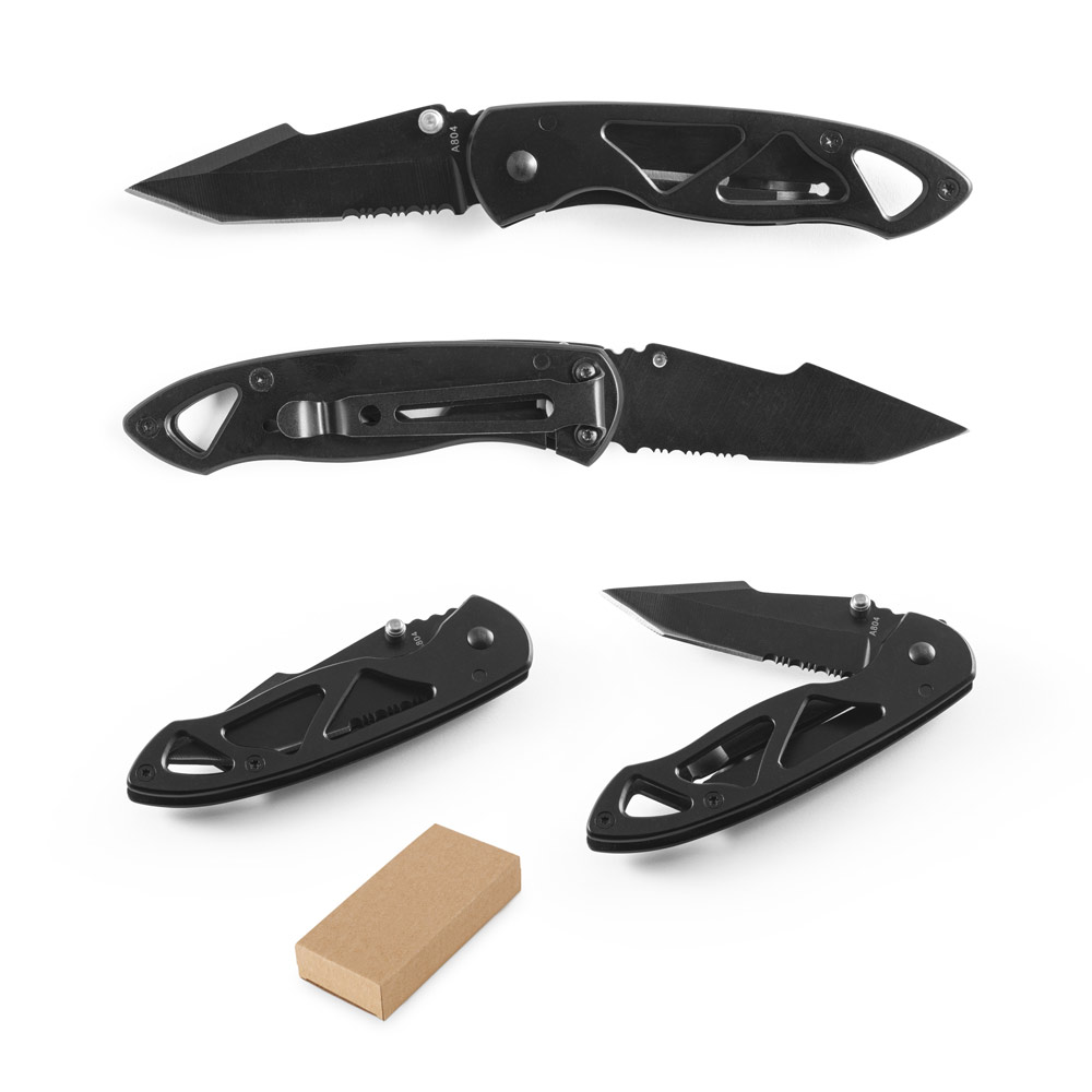 Canivete em aço inox e metal com fecho de segurança e clipe. Fornecido em caixa presente de papel kraft reciclado. 97 x 15 x 29mm | Caixa: 110 x 37 x 20 mm